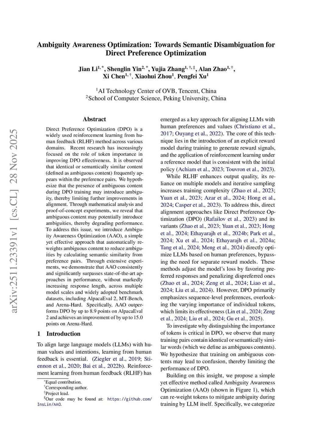 Direct Preference Optimization (DPO) is a widely used reinforcement learning from human feedback (RLHF) method across various domains. Recent research has increasingly focused on the role of token importance in improving DPO effectiveness. It is observed that identical or semantically similar content (defined as ambiguous content) frequently appears within the preference pairs. We hypothesize that the presence of ambiguous content during DPO training may introduce ambiguity, thereby limiting further improvements in alignment. Through mathematical analysis and proof-of-concept experiments, we reveal that ambiguous content may potentially introduce ambiguities, thereby degrading performance. To address this issue, we introduce Ambiguity Awareness Optimization (AAO), a simple yet effective approach that automatically re-weights ambiguous content to reduce ambiguities by calculating semantic similarity from preference pairs. Through extensive experiments, we demonstrate that AAO consistently and significantly surpasses state-of-the-art approaches in performance, without markedly increasing response length, across multiple model scales and widely adopted benchmark datasets, including AlpacaEval 2, MT-Bench, and Arena-Hard. Specifically, AAO outperforms DPO by up to 8.9 points on AlpacaEval 2 and achieves an improvement of by up to 15.0 points on Arena-Hard.