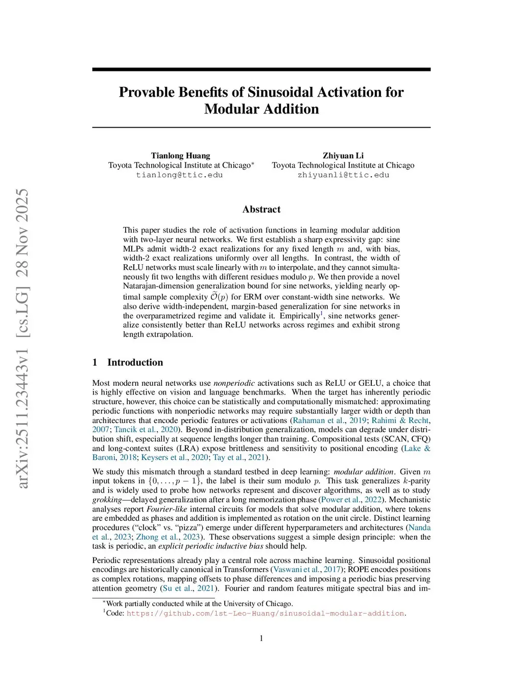 This paper studies the role of activation functions in learning modular addition with two-layer neural networks. We first establish a sharp expressivity gap: sine MLPs admit width- exact realizations for any fixed length and, with bias, width- exact realizations uniformly over all lengths. In contrast, the width of ReLU networks must scale linearly with to interpolate, and they cannot simultaneously fit two lengths with different residues modulo . We then provide a novel Natarajan-dimension generalization bound for sine networks, yielding nearly optimal sample complexity for ERM over constant-width sine networks. We also derive width-independent, margin-based generalization for sine networks in the overparametrized regime and validate it. Empirically, sine networks generalize consistently better than ReLU networks across regimes and exhibit strong length extrapolation.