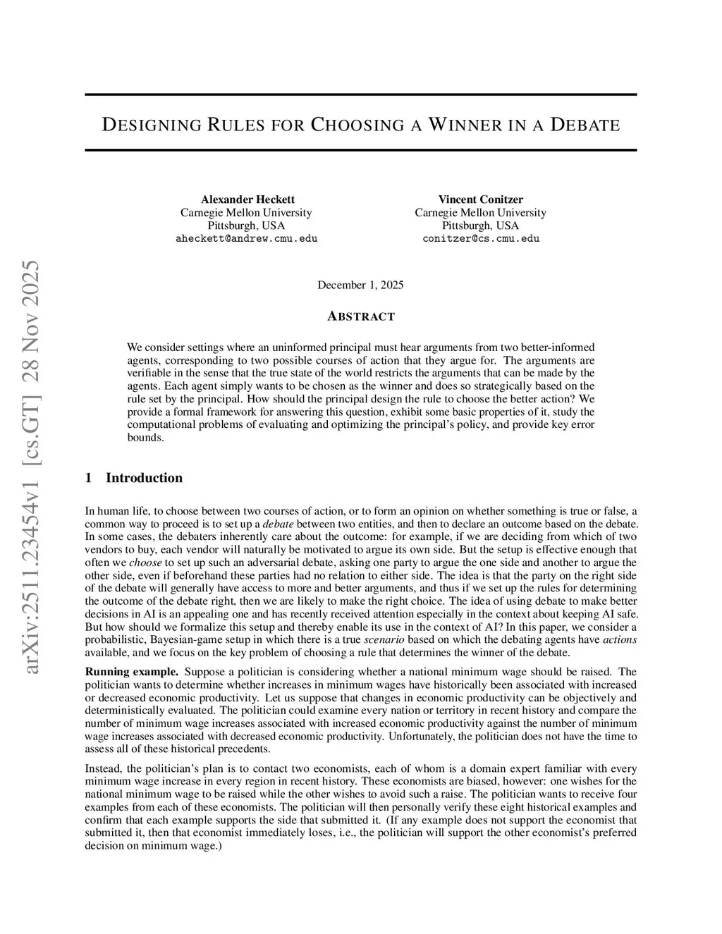 We consider settings where an uninformed principal must hear arguments from two better-informed agents, corresponding to two possible courses of action that they argue for. The arguments are verifiable in the sense that the true state of the world restricts the arguments that can be made by the agents. Each agent simply wants to be chosen as the winner and does so strategically based on the rule set by the principal. How should the principal design the rule to choose the better action? We provide a formal framework for answering this question, exhibit some basic properties of it, study the computational problems of evaluating and optimizing the principal's policy, and provide key error bounds.