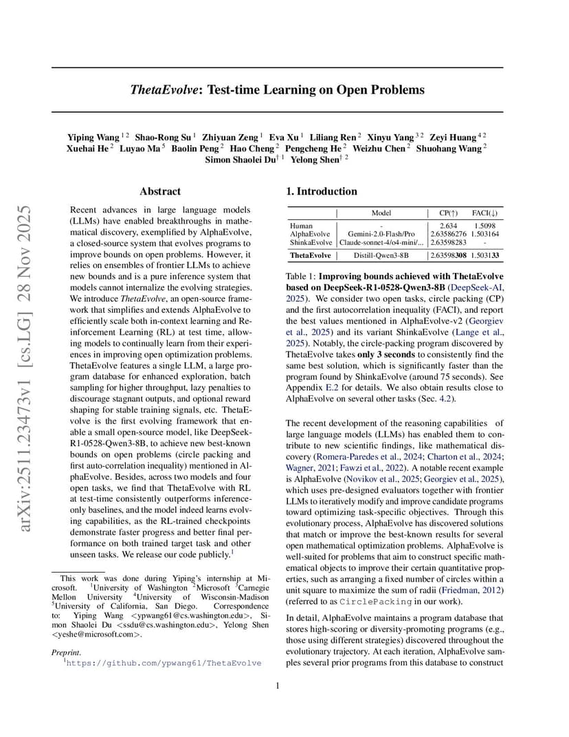 Recent advances in large language models (LLMs) have enabled breakthroughs in mathematical discovery, exemplified by AlphaEvolve, a closed-source system that evolves programs to improve bounds on open problems. However, it relies on ensembles of frontier LLMs to achieve new bounds and is a pure inference system that models cannot internalize the evolving strategies. We introduce ThetaEvolve, an open-source framework that simplifies and extends AlphaEvolve to efficiently scale both in-context learning and Reinforcement Learning (RL) at test time, allowing models to continually learn from their experiences in improving open optimization problems. ThetaEvolve features a single LLM, a large program database for enhanced exploration, batch sampling for higher throughput, lazy penalties to discourage stagnant outputs, and optional reward shaping for stable training signals, etc. ThetaEvolve is the first evolving framework that enable a small open-source model, like DeepSeek-R1-0528-Qwen3-8B, to achieve new best-known bounds on open problems (circle packing and first auto-correlation inequality) mentioned in AlphaEvolve. Besides, across two models and four open tasks, we find that ThetaEvolve with RL at test-time consistently outperforms inference-only baselines, and the model indeed learns evolving capabilities, as the RL-trained checkpoints demonstrate faster progress and better final performance on both trained target task and other unseen tasks. We release our code publicly:this https URL