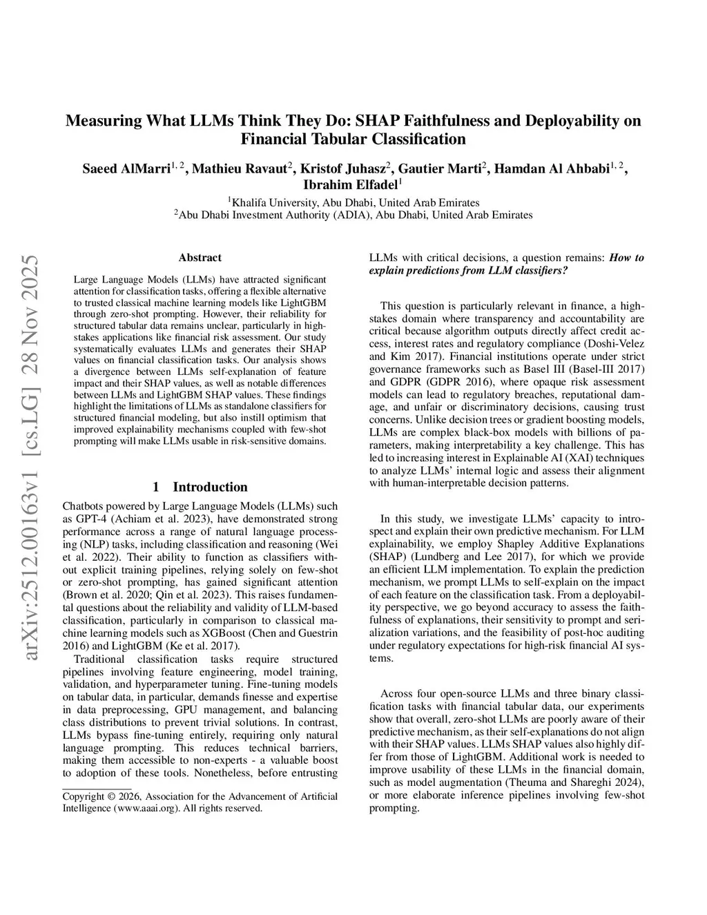 Large Language Models (LLMs) have attracted significant attention for classification tasks, offering a flexible alternative to trusted classical machine learning models like LightGBM through zero-shot prompting. However, their reliability for structured tabular data remains unclear, particularly in high stakes applications like financial risk assessment. Our study systematically evaluates LLMs and generates their SHAP values on financial classification tasks. Our analysis shows a divergence between LLMs self-explanation of feature impact and their SHAP values, as well as notable differences between LLMs and LightGBM SHAP values. These findings highlight the limitations of LLMs as standalone classifiers for structured financial modeling, but also instill optimism that improved explainability mechanisms coupled with few-shot prompting will make LLMs usable in risk-sensitive domains.