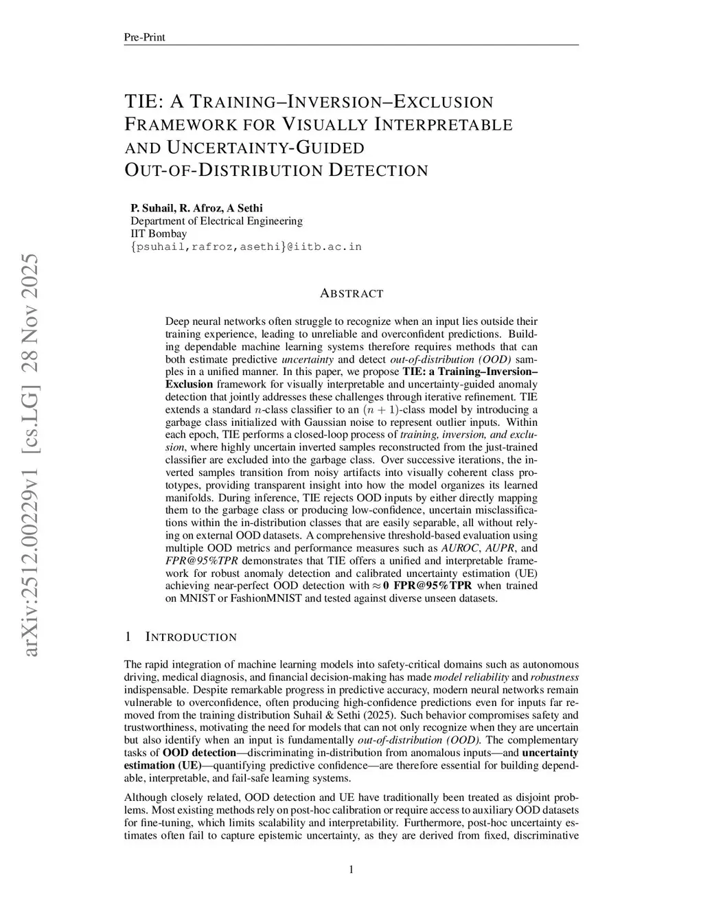 Deep neural networks often struggle to recognize when an input lies outside their training experience, leading to unreliable and overconfident predictions. Building dependable machine learning systems therefore requires methods that can both estimate predictive \textit{uncertainty} and detect \textit{out-of-distribution (OOD)} samples in a unified manner. In this paper, we propose \textbf{TIE: a Training--Inversion--Exclusion} framework for visually interpretable and uncertainty-guided anomaly detection that jointly addresses these challenges through iterative refinement. TIE extends a standard -class classifier to an -class model by introducing a garbage class initialized with Gaussian noise to represent outlier inputs. Within each epoch, TIE performs a closed-loop process of \textit{training, inversion, and exclusion}, where highly uncertain inverted samples reconstructed from the just-trained classifier are excluded into the garbage class. Over successive iterations, the inverted samples transition from noisy artifacts into visually coherent class prototypes, providing transparent insight into how the model organizes its learned manifolds. During inference, TIE rejects OOD inputs by either directly mapping them to the garbage class or producing low-confidence, uncertain misclassifications within the in-distribution classes that are easily separable, all without relying on external OOD datasets. A comprehensive threshold-based evaluation using multiple OOD metrics and performance measures such as \textit{AUROC}, \textit{AUPR}, and \textit{FPR@95\%TPR} demonstrates that TIE offers a unified and interpretable framework for robust anomaly detection and calibrated uncertainty estimation (UE) achieving near-perfect OOD detection with \textbf{\(\!\approx\!\) 0 FPR@95\%TPR} when trained on MNIST or FashionMNIST and tested against diverse unseen datasets.