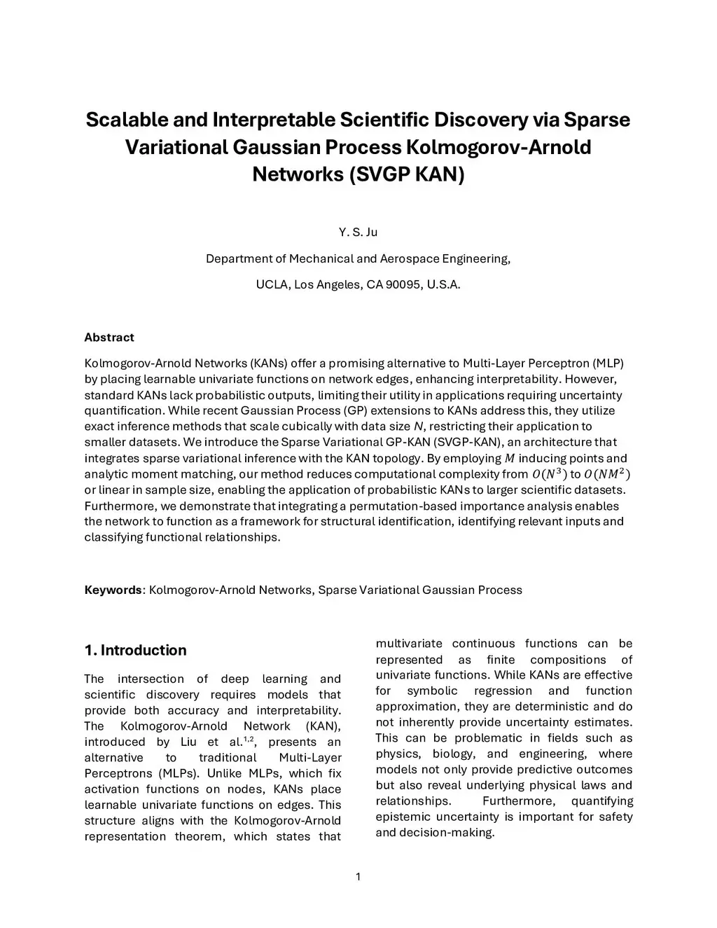 Kolmogorov-Arnold Networks (KANs) offer a promising alternative to Multi-Layer Perceptron (MLP) by placing learnable univariate functions on network edges, enhancing interpretability. However, standard KANs lack probabilistic outputs, limiting their utility in applications requiring uncertainty quantification. While recent Gaussian Process (GP) extensions to KANs address this, they utilize exact inference methods that scale cubically with data size N, restricting their application to smaller datasets. We introduce the Sparse Variational GP-KAN (SVGP-KAN), an architecture that integrates sparse variational inference with the KAN topology. By employing inducing points and analytic moment matching, our method reduces computational complexity from to or linear in sample size, enabling the application of probabilistic KANs to larger scientific datasets. Furthermore, we demonstrate that integrating a permutation-based importance analysis enables the network to function as a framework for structural identification, identifying relevant inputs and classifying functional relationships.