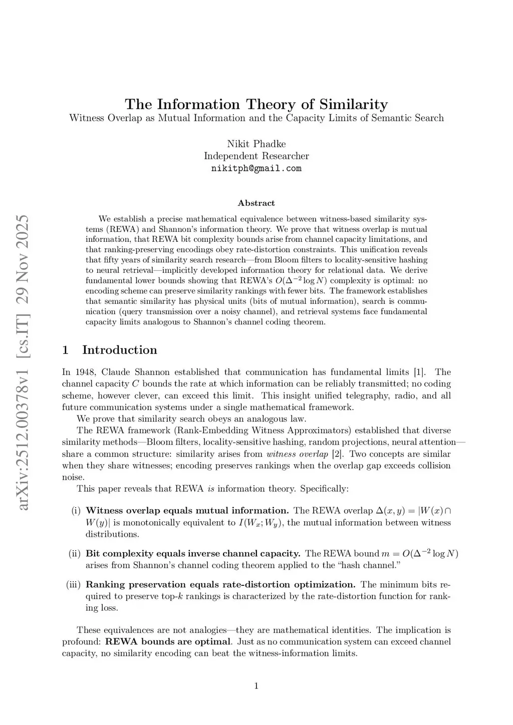 We establish a precise mathematical equivalence between witness-based similarity systems (REWA) and Shannon's information theory. We prove that witness overlap is mutual information, that REWA bit complexity bounds arise from channel capacity limitations, and that ranking-preserving encodings obey rate-distortion constraints. This unification reveals that fifty years of similarity search research -- from Bloom filters to locality-sensitive hashing to neural retrieval -- implicitly developed information theory for relational data. We derive fundamental lower bounds showing that REWA's complexity is optimal: no encoding scheme can preserve similarity rankings with fewer bits. The framework establishes that semantic similarity has physical units (bits of mutual information), search is communication (query transmission over a noisy channel), and retrieval systems face fundamental capacity limits analogous to Shannon's channel coding theorem.