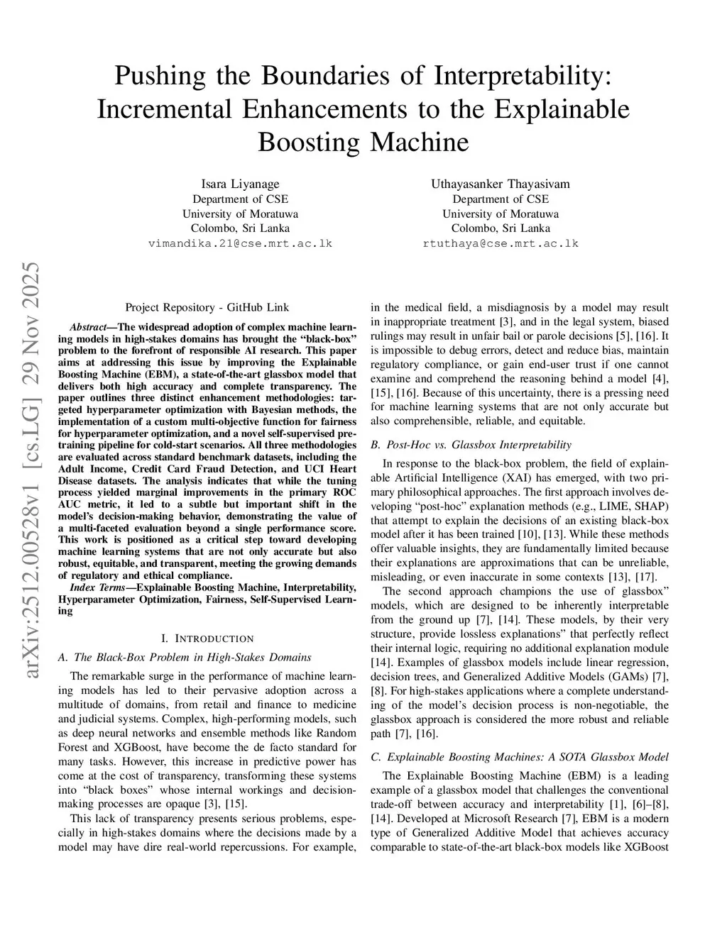 The widespread adoption of complex machine learning models in high-stakes domains has brought the "black-box" problem to the forefront of responsible AI research. This paper aims at addressing this issue by improving the Explainable Boosting Machine (EBM), a state-of-the-art glassbox model that delivers both high accuracy and complete transparency. The paper outlines three distinct enhancement methodologies: targeted hyperparameter optimization with Bayesian methods, the implementation of a custom multi-objective function for fairness for hyperparameter optimization, and a novel self-supervised pre-training pipeline for cold-start scenarios. All three methodologies are evaluated across standard benchmark datasets, including the Adult Income, Credit Card Fraud Detection, and UCI Heart Disease datasets. The analysis indicates that while the tuning process yielded marginal improvements in the primary ROC AUC metric, it led to a subtle but important shift in the model's decision-making behavior, demonstrating the value of a multi-faceted evaluation beyond a single performance score. This work is positioned as a critical step toward developing machine learning systems that are not only accurate but also robust, equitable, and transparent, meeting the growing demands of regulatory and ethical compliance.