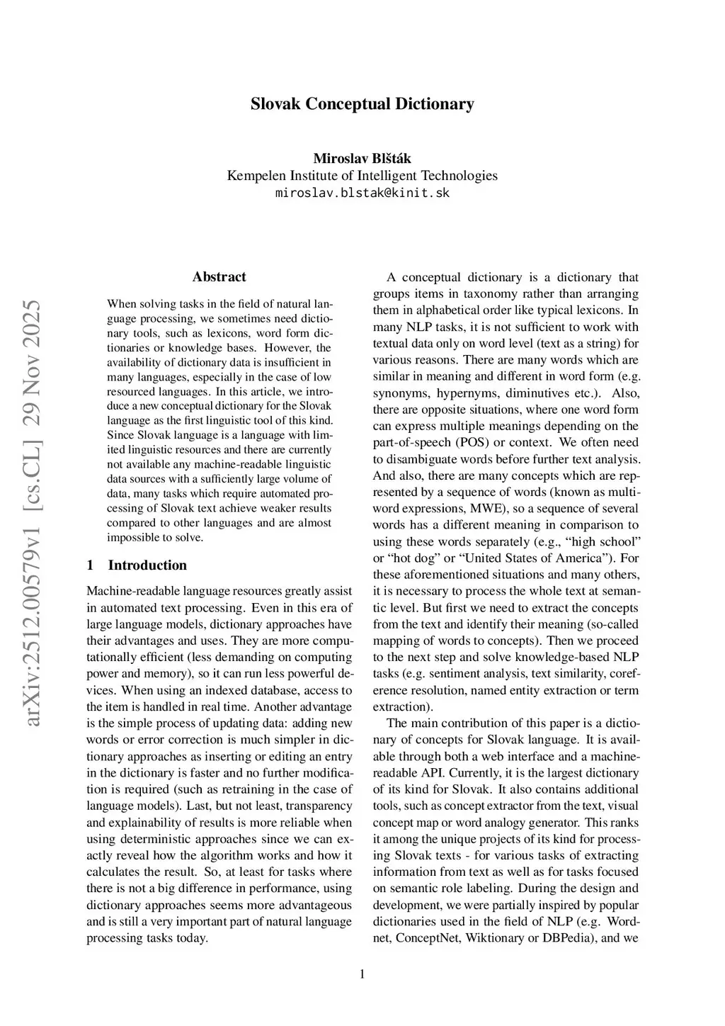 When solving tasks in the field of natural language processing, we sometimes need dictionary tools, such as lexicons, word form dictionaries or knowledge bases. However, the availability of dictionary data is insufficient in many languages, especially in the case of low resourced languages. In this article, we introduce a new conceptual dictionary for the Slovak language as the first linguistic tool of this kind. Since Slovak language is a language with limited linguistic resources and there are currently not available any machine-readable linguistic data sources with a sufficiently large volume of data, many tasks which require automated processing of Slovak text achieve weaker results compared to other languages and are almost impossible to solve.