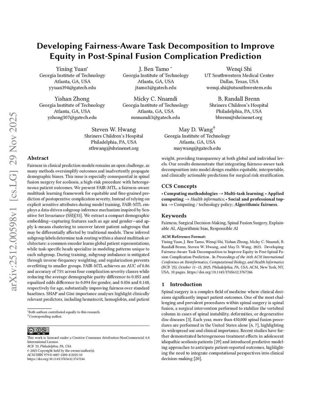 Developing Fairness-Aware Task Decomposition to Improve Equity in Post-Spinal Fusion Complication Prediction