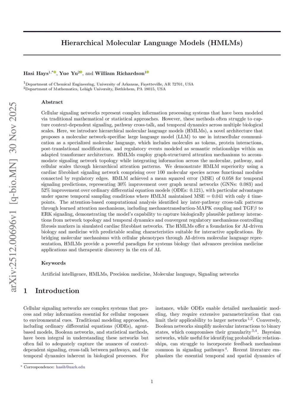 Artificial intelligence (AI) is reshaping computational and network biology by enabling new approaches to decode cellular communication networks. We introduce Hierarchical Molecular Language Models (HMLMs), a novel framework that models cellular signaling as a specialized molecular language, where signaling molecules function as tokens, protein interactions define syntax, and functional consequences constitute semantics. HMLMs employ a transformer-based architecture adapted to accommodate graph-structured signaling networks through information transducers, mathematical entities that capture how molecules receive, process, and transmit signals. The architecture integrates multi-modal data sources across molecular, pathway, and cellular scales through hierarchical attention mechanisms and scale-bridging operators that enable information flow across biological hierarchies. Applied to a complex network of cardiac fibroblast signaling, HMLMs outperformed traditional approaches in temporal dynamics prediction, particularly under sparse sampling conditions. Attention-based analysis revealed biologically meaningful crosstalk patterns, including previously uncharacterized interactions between signaling pathways. By bridging molecular mechanisms with cellular phenotypes through AI-driven molecular language representation, HMLMs establish a foundation for biology-oriented large language models (LLMs) that could be pre-trained on comprehensive pathway datasets and applied across diverse signaling systems and tissues, advancing precision medicine and therapeutic discovery.
