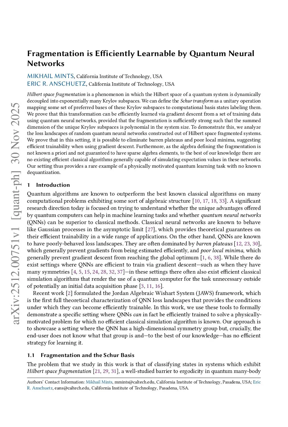 Hilbert space fragmentation is a phenomenon in which the Hilbert space of a quantum system is dynamically decoupled into exponentially many Krylov subspaces. We can define the Schur transform as a unitary operation mapping some set of preferred bases of these Krylov subspaces to computational basis states labeling them. We prove that this transformation can be efficiently learned via gradient descent from a set of training data using quantum neural networks, provided that the fragmentation is sufficiently strong such that the summed dimension of the unique Krylov subspaces is polynomial in the system size. To demonstrate this, we analyze the loss landscapes of random quantum neural networks constructed out of Hilbert space fragmented systems. We prove that in this setting, it is possible to eliminate barren plateaus and poor local minima, suggesting efficient trainability when using gradient descent. Furthermore, as the algebra defining the fragmentation is not known a priori and not guaranteed to have sparse algebra elements, to the best of our knowledge there are no existing efficient classical algorithms generally capable of simulating expectation values in these networks. Our setting thus provides a rare example of a physically motivated quantum learning task with no known dequantization.