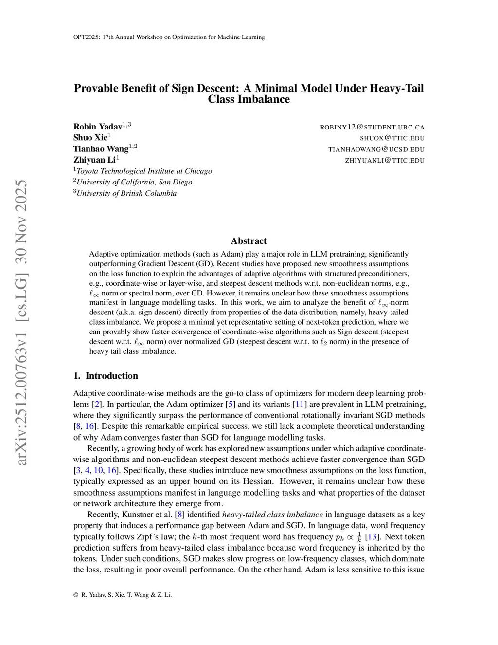 Adaptive optimization methods (such as Adam) play a major role in LLM pretraining, significantly outperforming Gradient Descent (GD). Recent studies have proposed new smoothness assumptions on the loss function to explain the advantages of adaptive algorithms with structured preconditioners, e.g., coordinate-wise or layer-wise, and steepest descent methods w.r.t. non-euclidean norms, e.g., norm or spectral norm, over GD. However, it remains unclear how these smoothness assumptions manifest in language modelling tasks. In this work, we aim to analyze the benefit of -norm descent (a.k.a. sign descent) directly from properties of the data distribution, namely, heavy-tailed class imbalance. We propose a minimal yet representative setting of next-token prediction, where we can provably show faster convergence of coordinate-wise algorithms such as Sign descent (steepest descent w.r.t. norm) over normalized GD (steepest descent w.r.t. to norm) in the presence of heavy tail class imbalance.