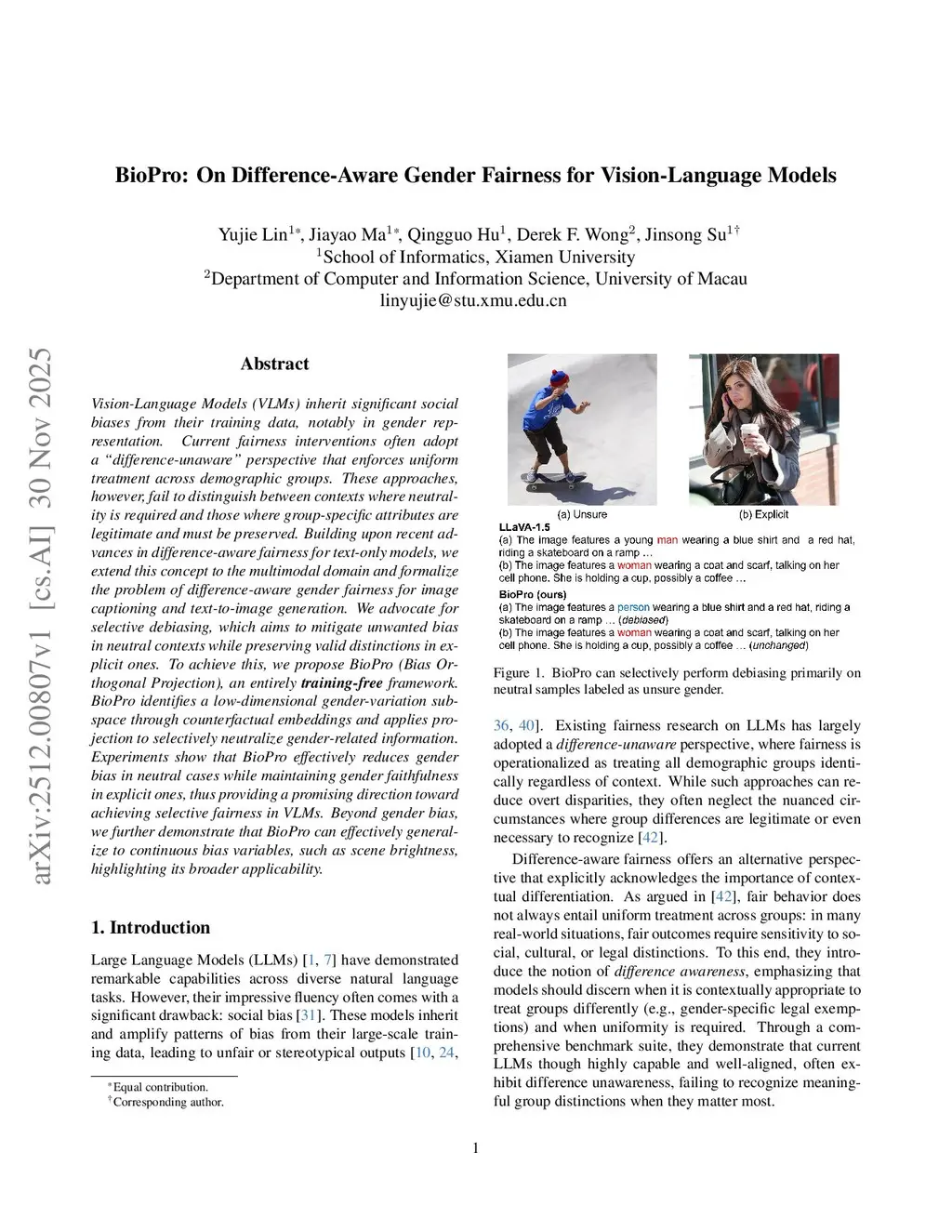 BioPro: On Difference-Aware Gender Fairness for Vision-Language Models