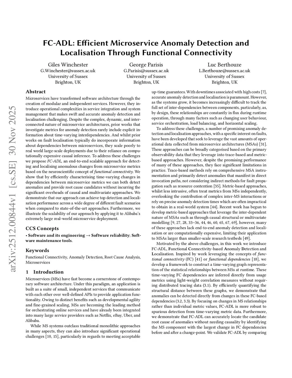 FC-ADL: Efficient Microservice Anomaly Detection and Localisation Through Functional Connectivity
