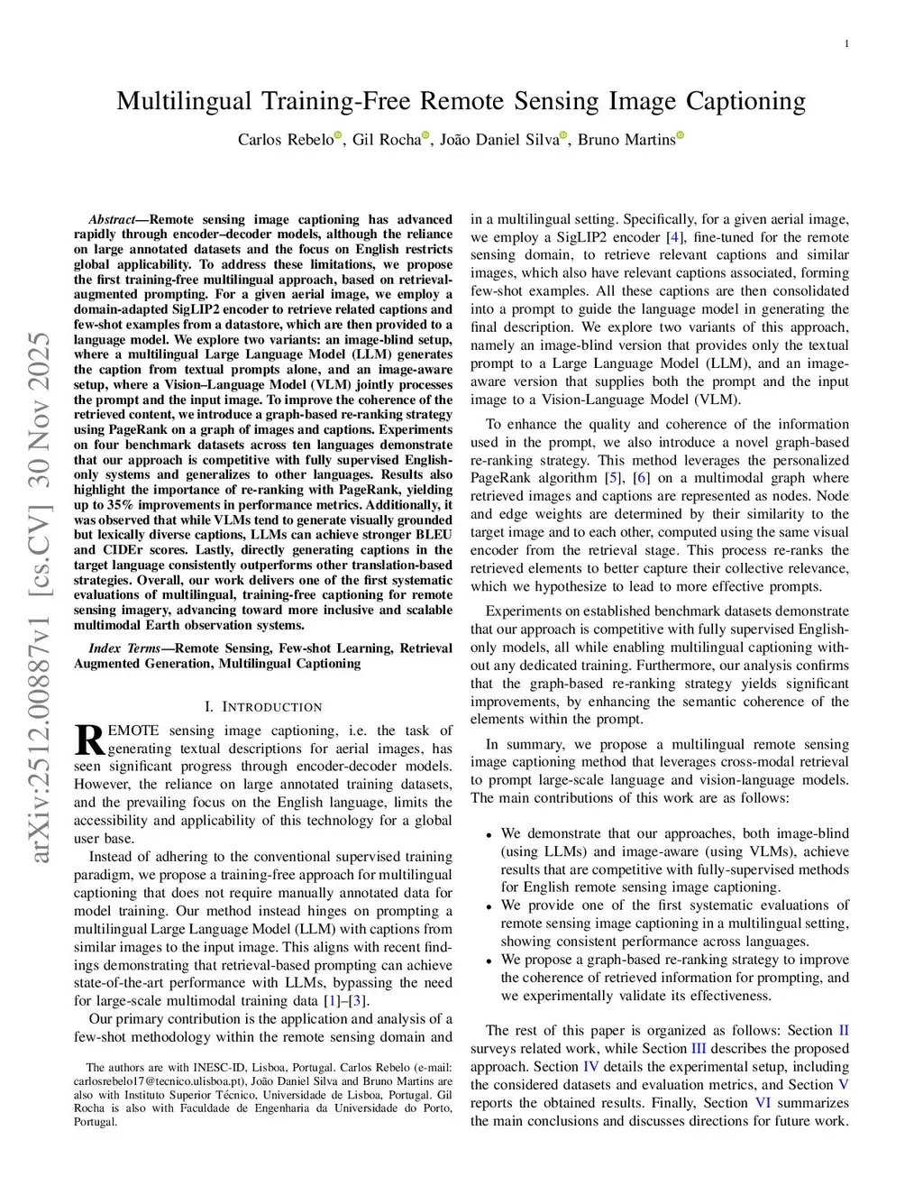 Remote sensing image captioning has advanced rapidly through encoder--decoder models, although the reliance on large annotated datasets and the focus on English restricts global applicability. To address these limitations, we propose the first training-free multilingual approach, based on retrieval-augmented prompting. For a given aerial image, we employ a domain-adapted SigLIP2 encoder to retrieve related captions and few-shot examples from a datastore, which are then provided to a language model. We explore two variants: an image-blind setup, where a multilingual Large Language Model (LLM) generates the caption from textual prompts alone, and an image-aware setup, where a Vision--Language Model (VLM) jointly processes the prompt and the input image. To improve the coherence of the retrieved content, we introduce a graph-based re-ranking strategy using PageRank on a graph of images and captions. Experiments on four benchmark datasets across ten languages demonstrate that our approach is competitive with fully supervised English-only systems and generalizes to other languages. Results also highlight the importance of re-ranking with PageRank, yielding up to 35% improvements in performance metrics. Additionally, it was observed that while VLMs tend to generate visually grounded but lexically diverse captions, LLMs can achieve stronger BLEU and CIDEr scores. Lastly, directly generating captions in the target language consistently outperforms other translation-based strategies. Overall, our work delivers one of the first systematic evaluations of multilingual, training-free captioning for remote sensing imagery, advancing toward more inclusive and scalable multimodal Earth observation systems.