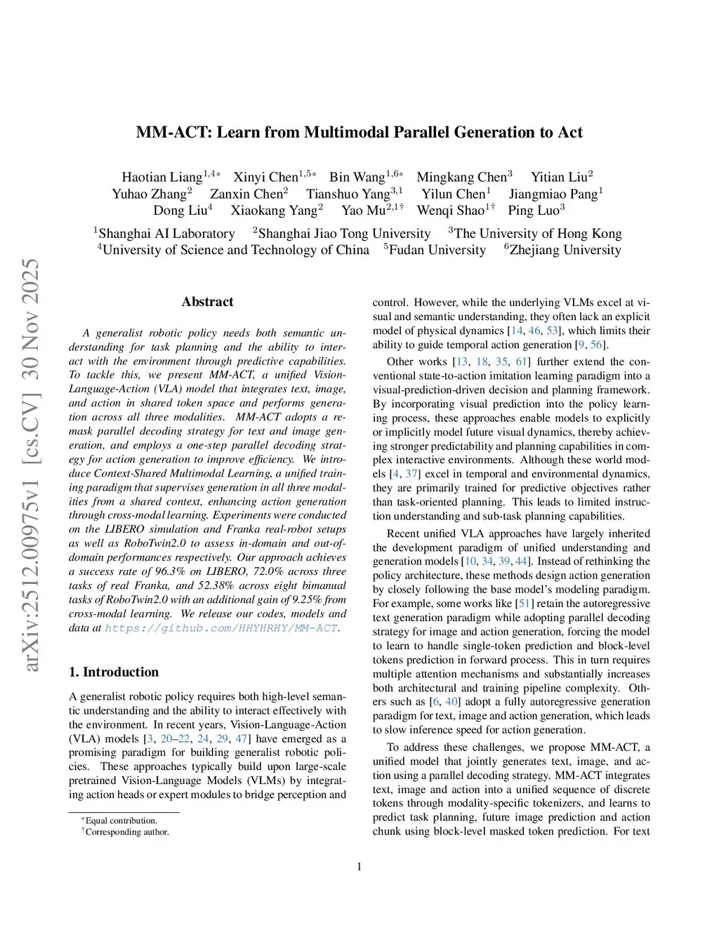 A generalist robotic policy needs both semantic understanding for task planning and the ability to interact with the environment through predictive capabilities. To tackle this, we present MM-ACT, a unified Vision-Language-Action (VLA) model that integrates text, image, and action in shared token space and performs generation across all three modalities. MM-ACT adopts a re-mask parallel decoding strategy for text and image generation, and employs a one-step parallel decoding strategy for action generation to improve efficiency. We introduce Context-Shared Multimodal Learning, a unified training paradigm that supervises generation in all three modalities from a shared context, enhancing action generation through cross-modal learning. Experiments were conducted on the LIBERO simulation and Franka real-robot setups as well as RoboTwin2.0 to assess in-domain and out-of-domain performances respectively. Our approach achieves a success rate of 96.3% on LIBERO, 72.0% across three tasks of real Franka, and 52.38% across eight bimanual tasks of RoboTwin2.0 with an additional gain of 9.25% from cross-modal learning. We release our codes, models and data atthis https URL.