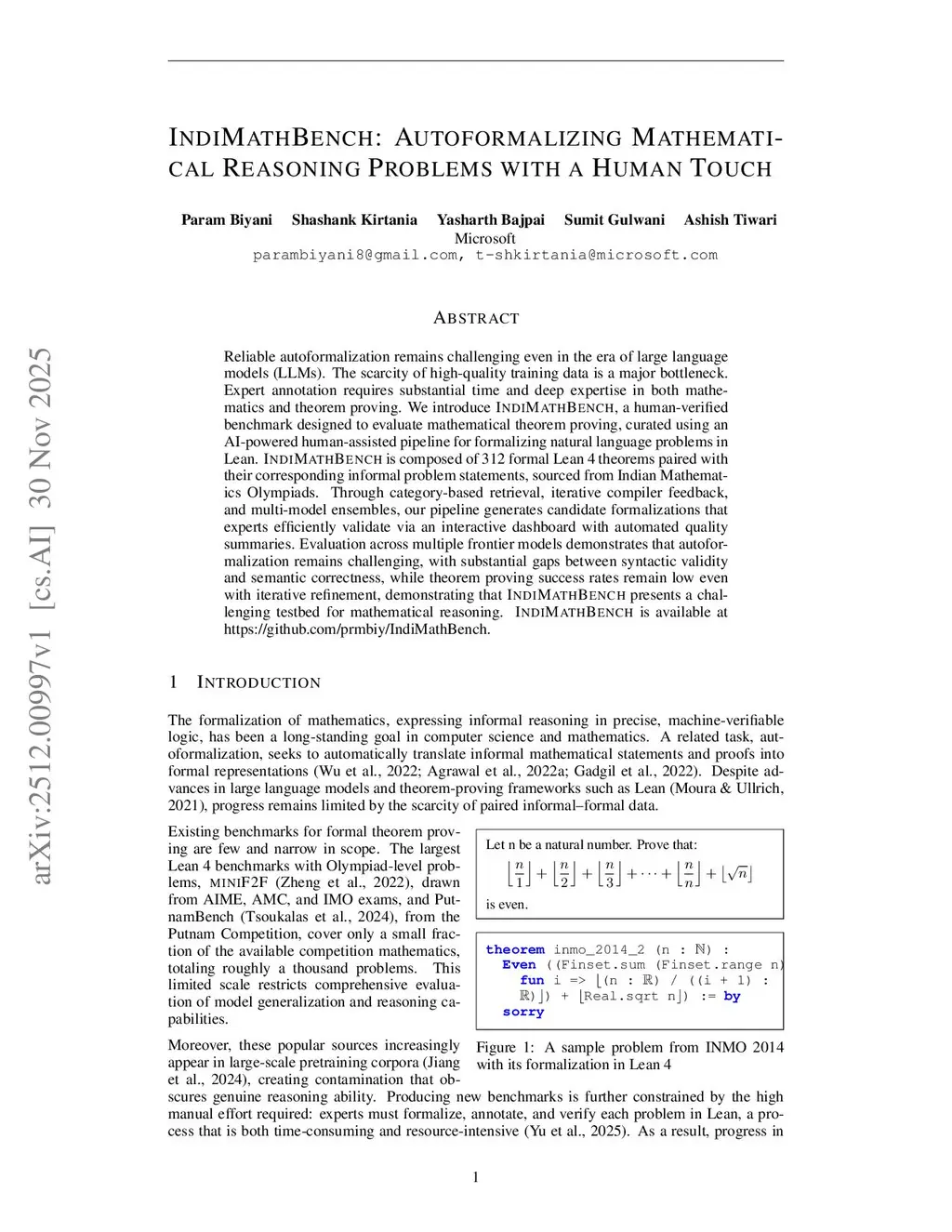 We introduce IndiMathBench, a human-verified benchmark designed to evaluate mathematical theorem proving, curated using an AI-powered human-assisted pipeline for formalizing natural language problems in Lean. IndiMathBench is composed of 312 formal Lean 4 theorems paired with their corresponding informal problem statements, sourced from Indian Mathematics Olympiads. Through category-based retrieval, iterative compiler feedback, and multi-model ensembles, our pipeline generates candidate formalizations that experts efficiently validate via an interactive dashboard with automated quality summaries. Evaluation across multiple frontier models demonstrates that autoformalization remains challenging, with substantial gaps between syntactic validity and semantic correctness, while theorem proving success rates remain low even with iterative refinement, demonstrating that \benchmark~presents a challenging testbed for mathematical reasoning. IndiMathBench is available atthis https URL.