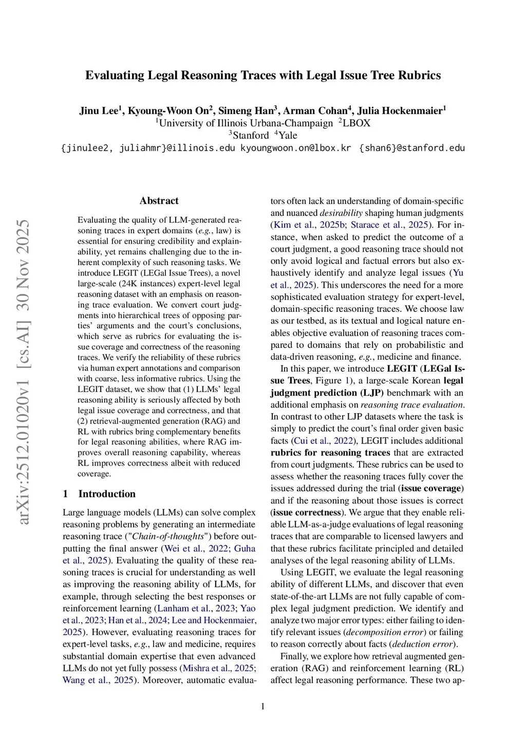 Evaluating the quality of LLM-generated reasoning traces in expert domains (e.g., law) is essential for ensuring credibility and explainability, yet remains challenging due to the inherent complexity of such reasoning tasks. We introduce LEGIT (LEGal Issue Trees), a novel large-scale (24K instances) expert-level legal reasoning dataset with an emphasis on reasoning trace evaluation. We convert court judgments into hierarchical trees of opposing parties' arguments and the court's conclusions, which serve as rubrics for evaluating the issue coverage and correctness of the reasoning traces. We verify the reliability of these rubrics via human expert annotations and comparison with coarse, less informative rubrics. Using the LEGIT dataset, we show that (1) LLMs' legal reasoning ability is seriously affected by both legal issue coverage and correctness, and that (2) retrieval-augmented generation (RAG) and RL with rubrics bring complementary benefits for legal reasoning abilities, where RAG improves overall reasoning capability, whereas RL improves correctness albeit with reduced coverage.