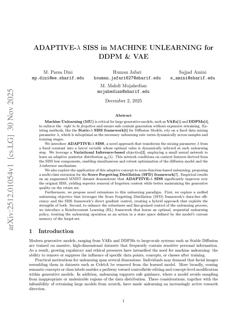 Machine Unlearning is essential for large generative models (VAEs, DDPMs) to comply with the right to be forgotten and prevent undesired content generation without costly retraining. Existing approaches, such as Static-lambda SISS for diffusion models, rely on a fixed mixing weight lambda, which is suboptimal because the required unlearning strength varies across samples and training stages.We propose Adaptive-lambda SISS, a principled extension that turns lambda into a latent variable dynamically inferred at each training step. A lightweight inference network parameterizes an adaptive posterior over lambda, conditioned on contextual features derived from the instantaneous SISS loss terms (retain/forget losses and their gradients). This enables joint optimization of the diffusion model and the lambda-inference mechanism via a variational objective, yielding significantly better trade-offs.We further extend the adaptive-lambda principle to score-based unlearning and introduce a multi-class variant of Score Forgetting Distillation. In addition, we present two new directions: (i) a hybrid objective combining the data-free efficiency of Score Forgetting Distillation with the direct gradient control of SISS, and (ii) a Reinforcement Learning formulation that treats unlearning as a sequential decision process, learning an optimal policy over a state space defined by the model's current memory of the forget set.Experiments on an augmented MNIST benchmark show that Adaptive-lambda SISS substantially outperforms the original static-lambda SISS, achieving stronger removal of forgotten classes while better preserving generation quality on the retain set.