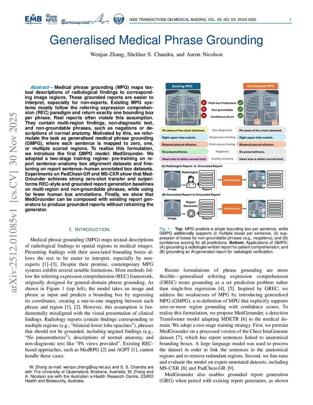Medical phrase grounding (MPG) maps textual descriptions of radiological findings to corresponding image regions. These grounded reports are easier to interpret, especially for non-experts. Existing MPG systems mostly follow the referring expression comprehension (REC) paradigm and return exactly one bounding box per phrase. Real reports often violate this assumption. They contain multi-region findings, non-diagnostic text, and non-groundable phrases, such as negations or descriptions of normal anatomy. Motivated by this, we reformulate the task as generalised medical phrase grounding (GMPG), where each sentence is mapped to zero, one, or multiple scored regions. To realise this formulation, we introduce the first GMPG model: MedGrounder. We adopted a two-stage training regime: pre-training on report sentence--anatomy box alignment datasets and fine-tuning on report sentence--human annotated box datasets. Experiments on PadChest-GR and MS-CXR show that MedGrounder achieves strong zero-shot transfer and outperforms REC-style and grounded report generation baselines on multi-region and non-groundable phrases, while using far fewer human box annotations. Finally, we show that MedGrounder can be composed with existing report generators to produce grounded reports without retraining the generator.