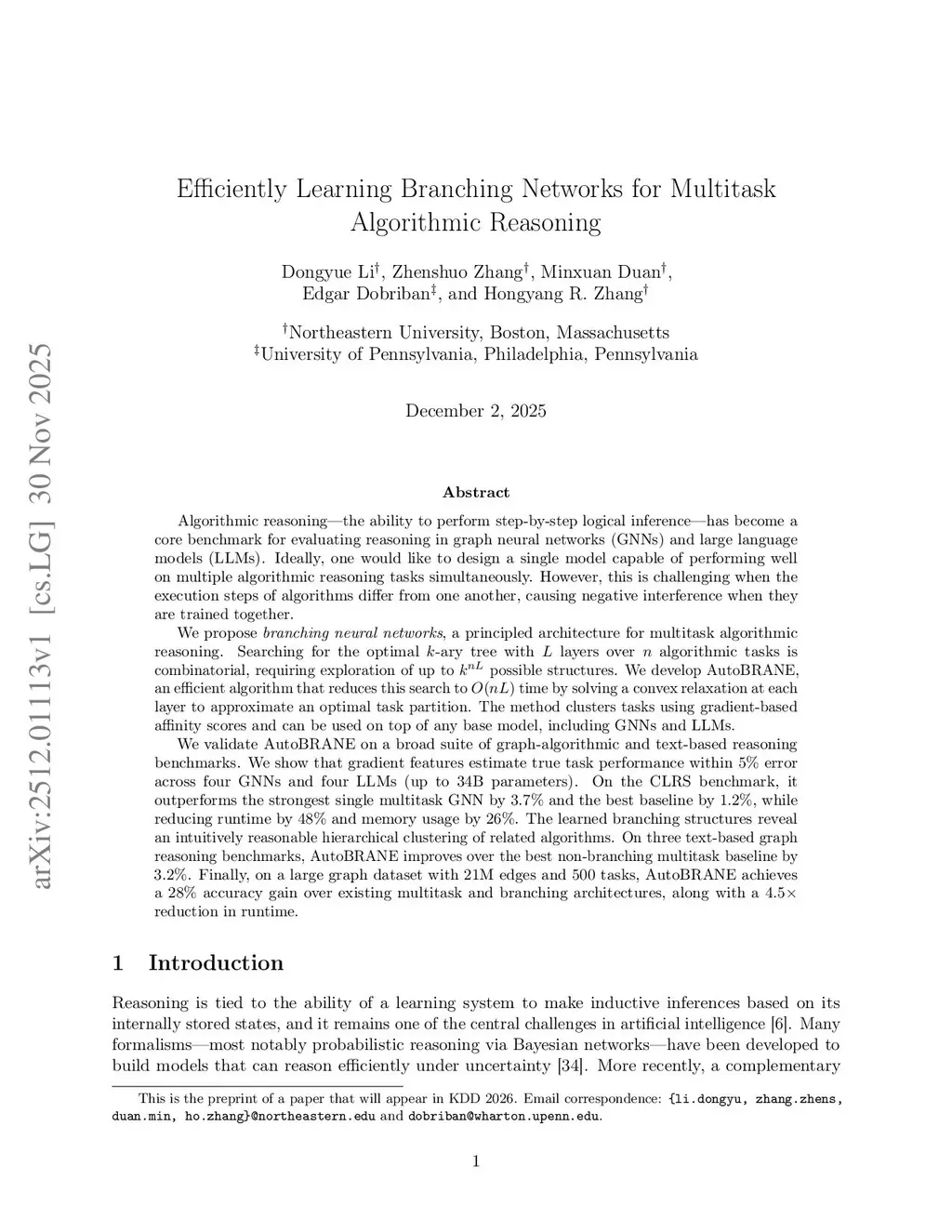 Algorithmic reasoning -- the ability to perform step-by-step logical inference -- has become a core benchmark for evaluating reasoning in graph neural networks (GNNs) and large language models (LLMs). Ideally, one would like to design a single model capable of performing well on multiple algorithmic reasoning tasks simultaneously. However, this is challenging when the execution steps of algorithms differ from one another, causing negative interference when they are trained together.We propose branching neural networks, a principled architecture for multitask algorithmic reasoning. Searching for the optimal -ary tree with layers over algorithmic tasks is combinatorial, requiring exploration of up to possible structures. We develop AutoBRANE, an efficient algorithm that reduces this search to time by solving a convex relaxation at each layer to approximate an optimal task partition. The method clusters tasks using gradient-based affinity scores and can be used on top of any base model, including GNNs and LLMs.We validate AutoBRANE on a broad suite of graph-algorithmic and text-based reasoning benchmarks. We show that gradient features estimate true task performance within 5% error across four GNNs and four LLMs (up to 34B parameters). On the CLRS benchmark, it outperforms the strongest single multitask GNN by 3.7% and the best baseline by 1.2%, while reducing runtime by 48% and memory usage by 26%. The learned branching structures reveal an intuitively reasonable hierarchical clustering of related algorithms. On three text-based graph reasoning benchmarks, AutoBRANE improves over the best non-branching multitask baseline by 3.2%. Finally, on a large graph dataset with 21M edges and 500 tasks, AutoBRANE achieves a 28% accuracy gain over existing multitask and branching architectures, along with a 4.5 reduction in runtime.