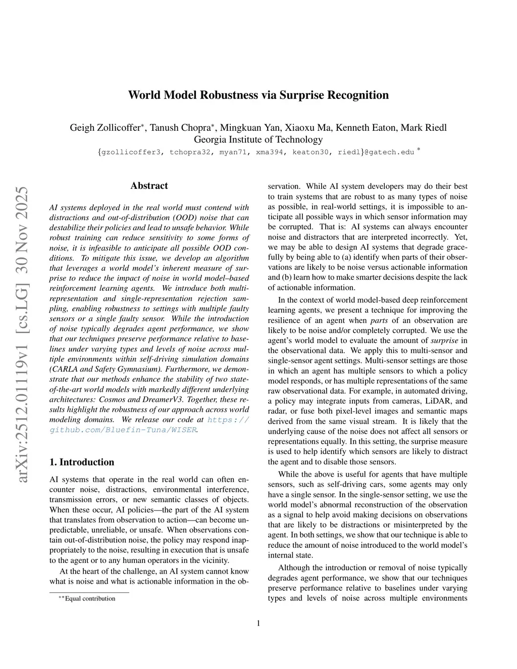 AI systems deployed in the real world must contend with distractions and out-of-distribution (OOD) noise that can destabilize their policies and lead to unsafe behavior. While robust training can reduce sensitivity to some forms of noise, it is infeasible to anticipate all possible OOD conditions. To mitigate this issue, we develop an algorithm that leverages a world model's inherent measure of surprise to reduce the impact of noise in world model--based reinforcement learning agents. We introduce both multi-representation and single-representation rejection sampling, enabling robustness to settings with multiple faulty sensors or a single faulty sensor. While the introduction of noise typically degrades agent performance, we show that our techniques preserve performance relative to baselines under varying types and levels of noise across multiple environments within self-driving simulation domains (CARLA and Safety Gymnasium). Furthermore, we demonstrate that our methods enhance the stability of two state-of-the-art world models with markedly different underlying architectures: Cosmos and DreamerV3. Together, these results highlight the robustness of our approach across world modeling domains. We release our code atthis https URL.