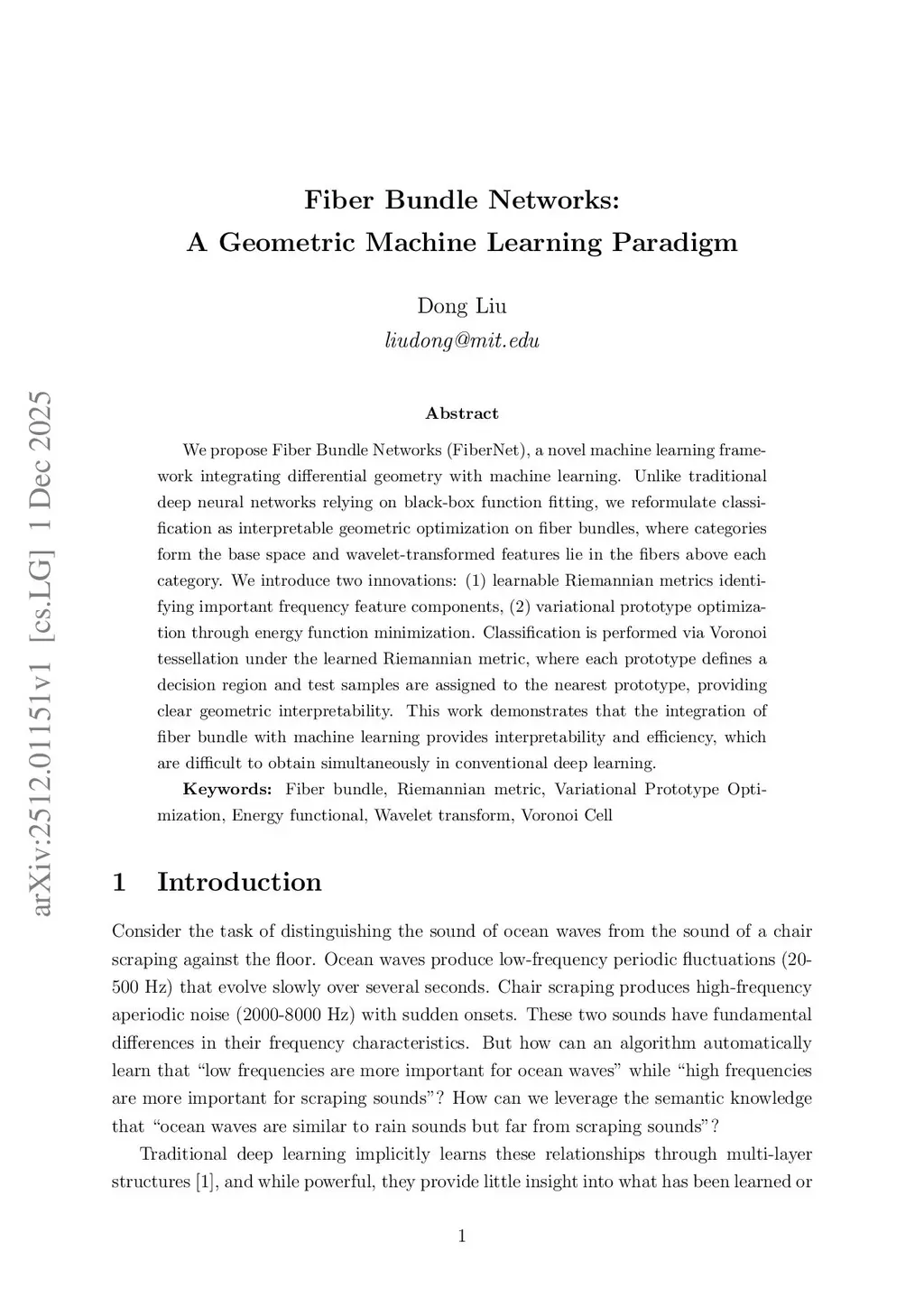 We propose Fiber Bundle Networks (FiberNet), a novel machine learning framework integrating differential geometry with machine learning. Unlike traditional deep neural networks relying on black-box function fitting, we reformulate classification as interpretable geometric optimization on fiber bundles, where categories form the base space and wavelet-transformed features lie in the fibers above each category. We introduce two innovations: (1) learnable Riemannian metrics identifying important frequency feature components, (2) variational prototype optimization through energy function minimization. Classification is performed via Voronoi tessellation under the learned Riemannian metric, where each prototype defines a decision region and test samples are assigned to the nearest prototype, providing clear geometric interpretability. This work demonstrates that the integration of fiber bundle with machine learning provides interpretability and efficiency, which are difficult to obtain simultaneously in conventional deep learning.