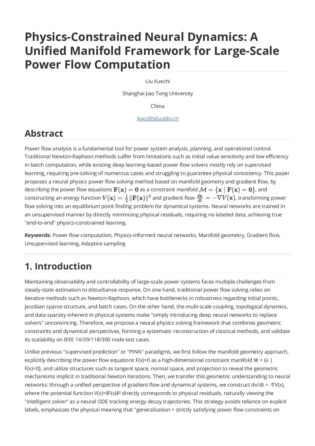 Physics-Constrained Neural Dynamics: A Unified Manifold Framework for Large-Scale Power Flow Computation