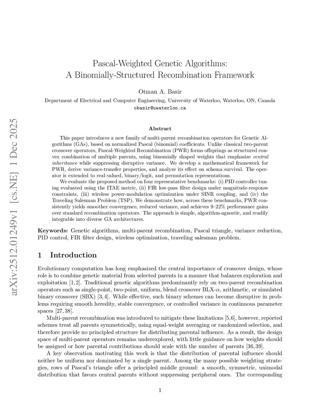 This paper introduces a new family of multi-parent recombination operators for Genetic Algorithms (GAs), based on normalized Pascal (binomial) coefficients. Unlike classical two-parent crossover operators, Pascal-Weighted Recombination (PWR) forms offsprings as structured convex combination of multiple parents, using binomially shaped weights that emphasize central inheritance while suppressing disruptive variance. We develop a mathematical framework for PWR, derive variance-transfer properties, and analyze its effect on schema survival. The operator is extended to real-valued, binary/logit, and permutation representations.We evaluate the proposed method on four representative benchmarks: (i) PID controller tuning evaluated using the ITAE metric, (ii) FIR low-pass filter design under magnitude-response constraints, (iii) wireless power-modulation optimization under SINR coupling, and (iv) the Traveling Salesman Problem (TSP). We demonstrate how, across these benchmarks, PWR consistently yields smoother convergence, reduced variance, and achieves 9-22% performance gains over standard recombination operators. The approach is simple, algorithm-agnostic, and readily integrable into diverse GA architectures.