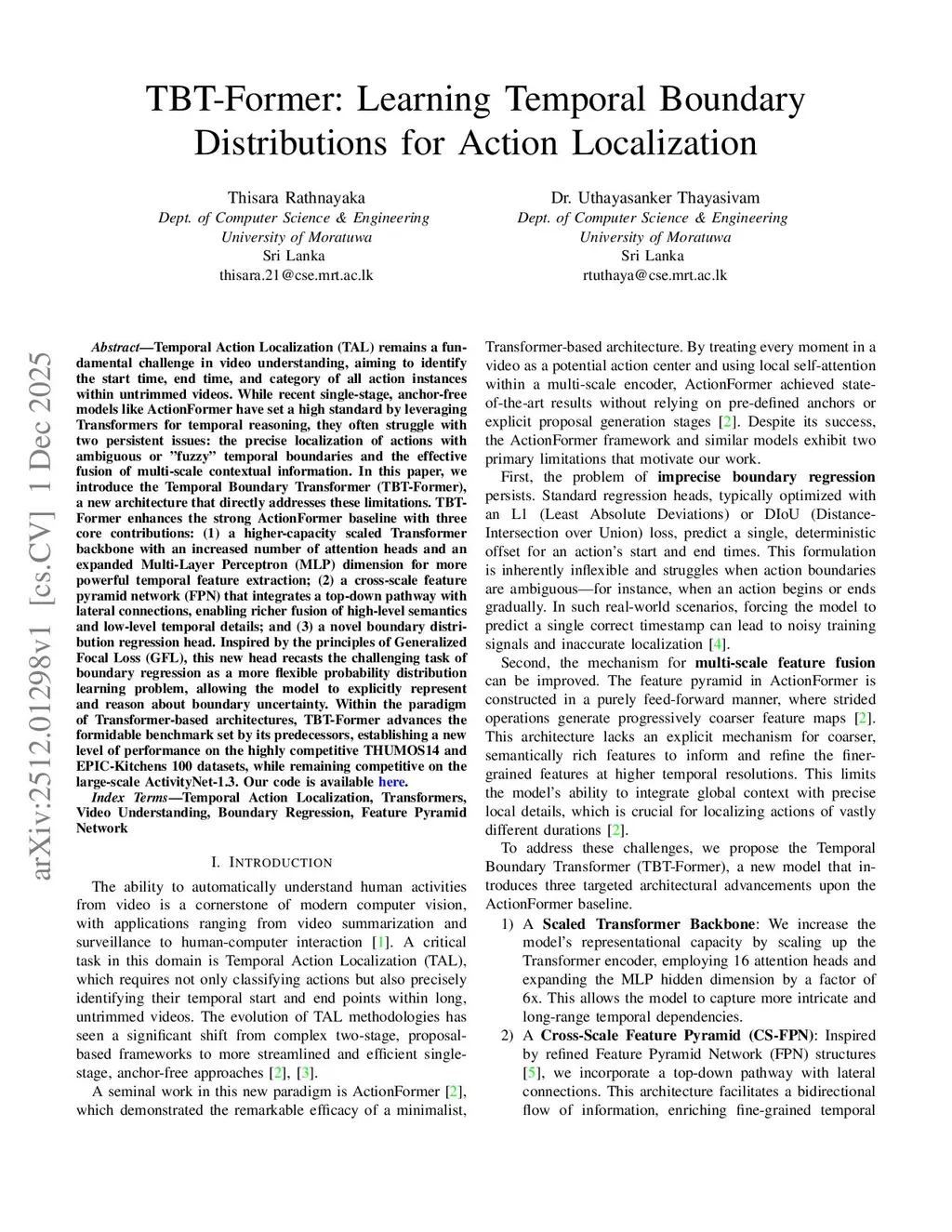 Temporal Action Localization (TAL) remains a fundamental challenge in video understanding, aiming to identify the start time, end time, and category of all action instances within untrimmed videos. While recent single-stage, anchor-free models like ActionFormer have set a high standard by leveraging Transformers for temporal reasoning, they often struggle with two persistent issues: the precise localization of actions with ambiguous or "fuzzy" temporal boundaries and the effective fusion of multi-scale contextual information. In this paper, we introduce the Temporal Boundary Transformer (TBT-Former), a new architecture that directly addresses these limitations. TBT-Former enhances the strong ActionFormer baseline with three core contributions: (1) a higher-capacity scaled Transformer backbone with an increased number of attention heads and an expanded Multi-Layer Perceptron (MLP) dimension for more powerful temporal feature extraction; (2) a cross-scale feature pyramid network (FPN) that integrates a top-down pathway with lateral connections, enabling richer fusion of high-level semantics and low-level temporal details; and (3) a novel boundary distribution regression head. Inspired by the principles of Generalized Focal Loss (GFL), this new head recasts the challenging task of boundary regression as a more flexible probability distribution learning problem, allowing the model to explicitly represent and reason about boundary uncertainty. Within the paradigm of Transformer-based architectures, TBT-Former advances the formidable benchmark set by its predecessors, establishing a new level of performance on the highly competitive THUMOS14 and EPIC-Kitchens 100 datasets, while remaining competitive on the large-scale ActivityNet-1.3. Our code is available atthis https URL