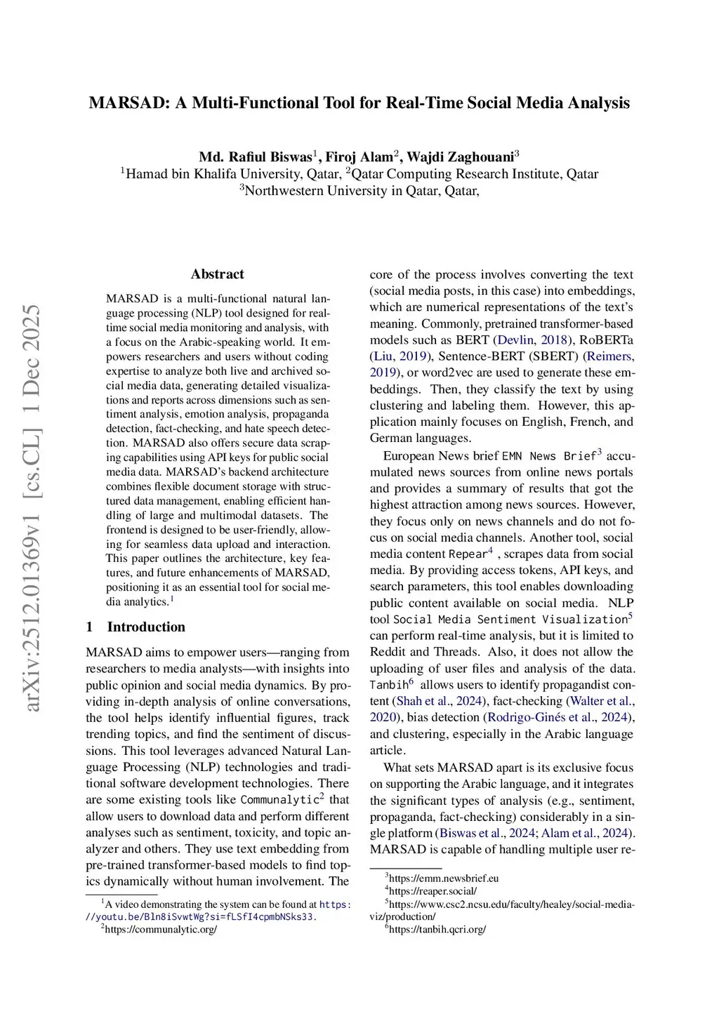 MARSAD is a multifunctional natural language processing (NLP) platform designed for real-time social media monitoring and analysis, with a particular focus on the Arabic-speaking world. It enables researchers and non-technical users alike to examine both live and archived social media content, producing detailed visualizations and reports across various dimensions, including sentiment analysis, emotion analysis, propaganda detection, fact-checking, and hate speech detection. The platform also provides secure data-scraping capabilities through API keys for accessing public social media data. MARSAD's backend architecture integrates flexible document storage with structured data management, ensuring efficient processing of large and multimodal datasets. Its user-friendly frontend supports seamless data upload and interaction.