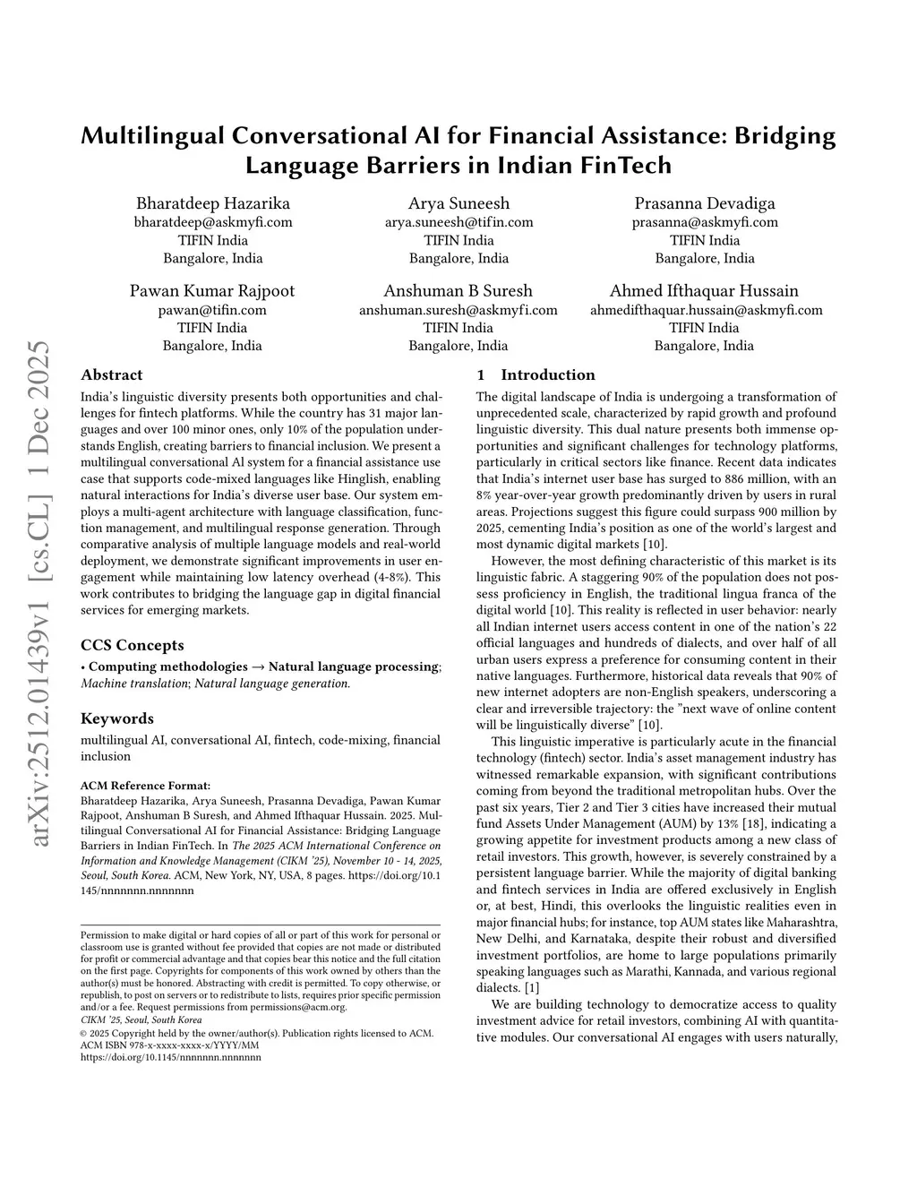 India's linguistic diversity presents both opportunities and challenges for fintech platforms. While the country has 31 major languages and over 100 minor ones, only 10\% of the population understands English, creating barriers to financial inclusion. We present a multilingual conversational AI system for a financial assistance use case that supports code-mixed languages like Hinglish, enabling natural interactions for India's diverse user base. Our system employs a multi-agent architecture with language classification, function management, and multilingual response generation. Through comparative analysis of multiple language models and real-world deployment, we demonstrate significant improvements in user engagement while maintaining low latency overhead (4-8\%). This work contributes to bridging the language gap in digital financial services for emerging markets.