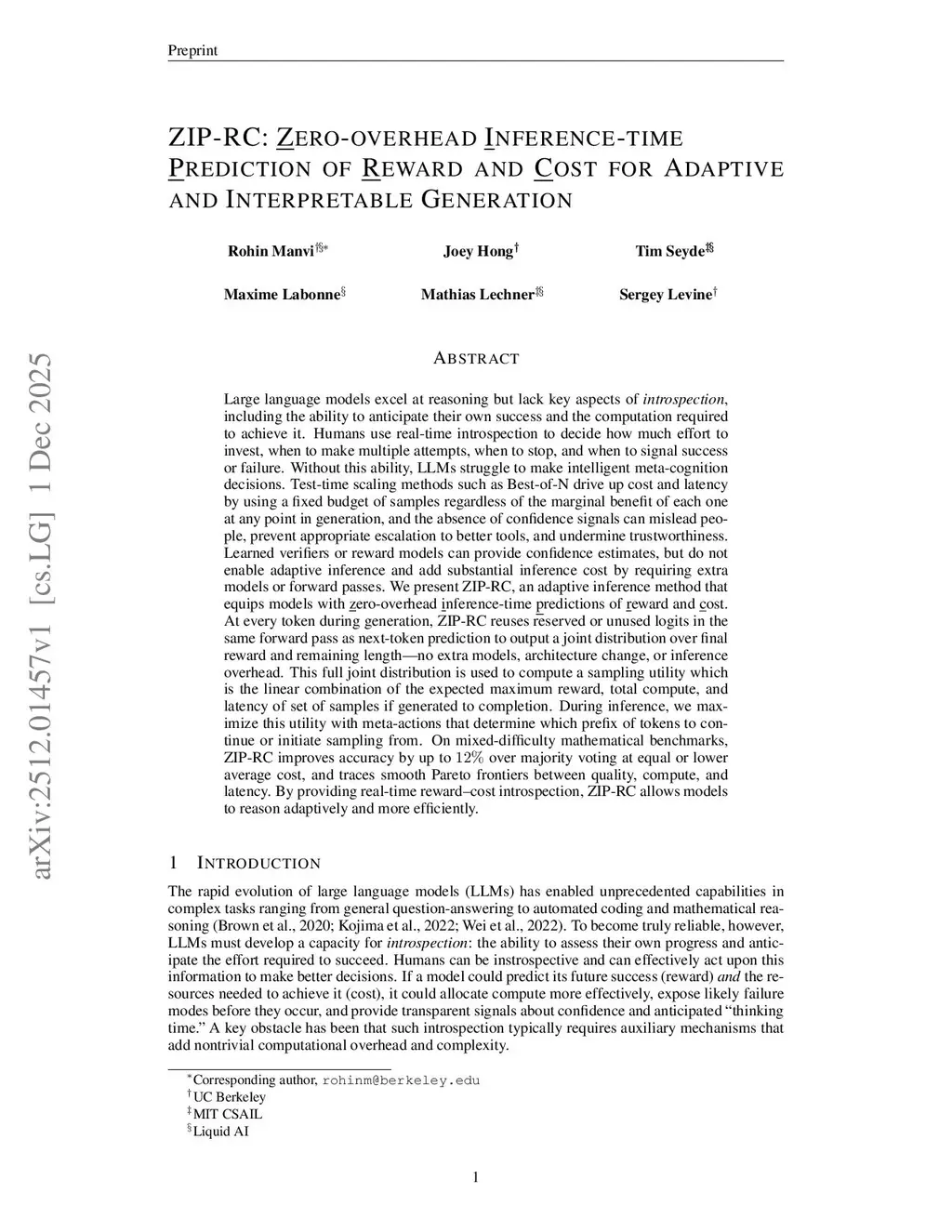 Large language models excel at reasoning but lack key aspects of introspection, including anticipating their own success and the computation required to achieve it. Humans use real-time introspection to decide how much effort to invest, when to make multiple attempts, when to stop, and when to signal success or failure. Without this, LLMs struggle to make intelligent meta-cognition decisions. Test-time scaling methods like Best-of-N drive up cost and latency by using a fixed budget of samples regardless of the marginal benefit of each one at any point in generation, and the absence of confidence signals can mislead people, prevent appropriate escalation to better tools, and undermine trustworthiness. Learned verifiers or reward models can provide confidence estimates, but do not enable adaptive inference and add substantial cost by requiring extra models or forward passes. We present ZIP-RC, which equips models with zero-overhead introspective predictions of reward and cost. At every token, ZIP-RC reuses reserved or unused logits in the same forward pass as next-token prediction to output a joint distribution over final reward and remaining length -- no extra models, architecture change, or inference overhead. This full joint distribution is used to compute a sampling utility which is the linear combination of the expected maximum reward, total compute, and latency of set of samples if generated to completion. During inference, we maximize this utility with meta-actions that determine which prefix of tokens to continue or initiate sampling from. On mixed-difficulty mathematical benchmarks, ZIP-RC improves accuracy by up to 12% over majority voting at equal or lower average cost, and traces smooth Pareto frontiers between quality, compute, and latency. By providing real-time reward-cost introspection, ZIP-RC enables adaptive, efficient reasoning.