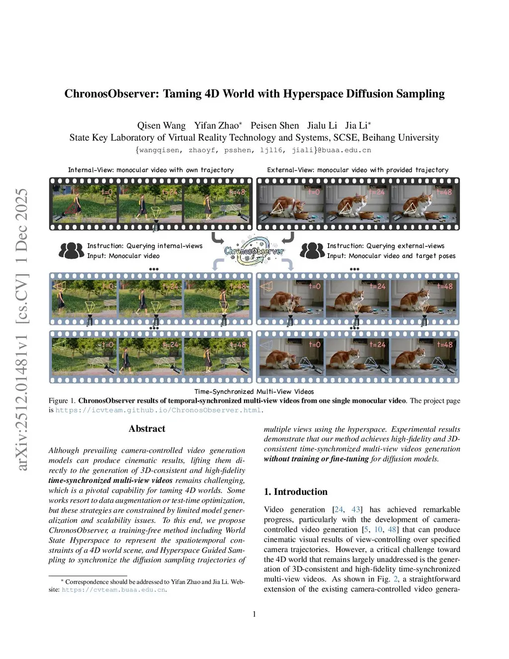 Although prevailing camera-controlled video generation models can produce cinematic results, lifting them directly to the generation of 3D-consistent and high-fidelity time-synchronized multi-view videos remains challenging, which is a pivotal capability for taming 4D worlds. Some works resort to data augmentation or test-time optimization, but these strategies are constrained by limited model generalization and scalability issues. To this end, we propose ChronosObserver, a training-free method including World State Hyperspace to represent the spatiotemporal constraints of a 4D world scene, and Hyperspace Guided Sampling to synchronize the diffusion sampling trajectories of multiple views using the hyperspace. Experimental results demonstrate that our method achieves high-fidelity and 3D-consistent time-synchronized multi-view videos generation without training or fine-tuning for diffusion models.