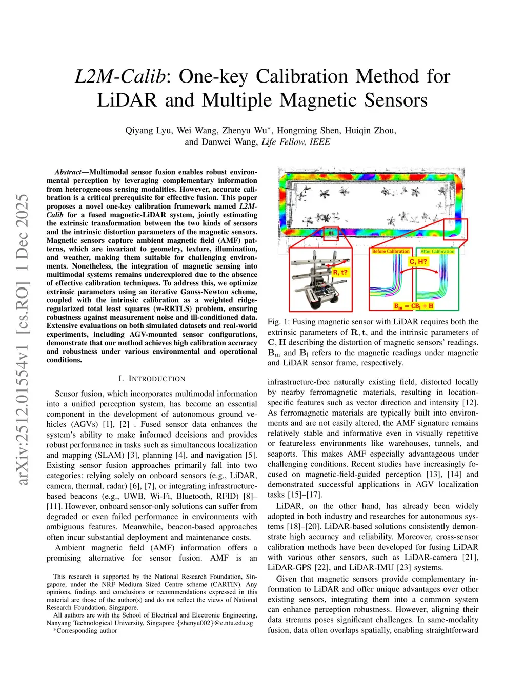 Multimodal sensor fusion enables robust environmental perception by leveraging complementary information from heterogeneous sensing modalities. However, accurate calibration is a critical prerequisite for effective fusion. This paper proposes a novel one-key calibration framework named L2M-Calib for a fused magnetic-LiDAR system, jointly estimating the extrinsic transformation between the two kinds of sensors and the intrinsic distortion parameters of the magnetic sensors. Magnetic sensors capture ambient magnetic field (AMF) patterns, which are invariant to geometry, texture, illumination, and weather, making them suitable for challenging environments. Nonetheless, the integration of magnetic sensing into multimodal systems remains underexplored due to the absence of effective calibration techniques. To address this, we optimize extrinsic parameters using an iterative Gauss-Newton scheme, coupled with the intrinsic calibration as a weighted ridge-regularized total least squares (w-RRTLS) problem, ensuring robustness against measurement noise and ill-conditioned data. Extensive evaluations on both simulated datasets and real-world experiments, including AGV-mounted sensor configurations, demonstrate that our method achieves high calibration accuracy and robustness under various environmental and operational conditions.