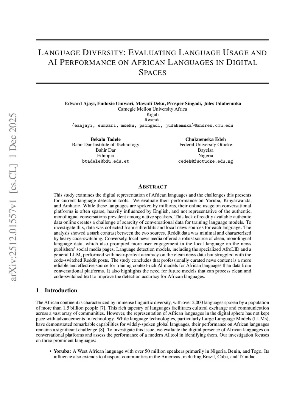 This study examines the digital representation of African languages and the challenges this presents for current language detection tools. We evaluate their performance on Yoruba, Kinyarwanda, and Amharic. While these languages are spoken by millions, their online usage on conversational platforms is often sparse, heavily influenced by English, and not representative of the authentic, monolingual conversations prevalent among native speakers. This lack of readily available authentic data online creates a challenge of scarcity of conversational data for training language models. To investigate this, data was collected from subreddits and local news sources for each language. The analysis showed a stark contrast between the two sources. Reddit data was minimal and characterized by heavy code-switching. Conversely, local news media offered a robust source of clean, monolingual language data, which also prompted more user engagement in the local language on the news publishers social media pages. Language detection models, including the specialized AfroLID and a general LLM, performed with near-perfect accuracy on the clean news data but struggled with the code-switched Reddit posts. The study concludes that professionally curated news content is a more reliable and effective source for training context-rich AI models for African languages than data from conversational platforms. It also highlights the need for future models that can process clean and code-switched text to improve the detection accuracy for African languages.