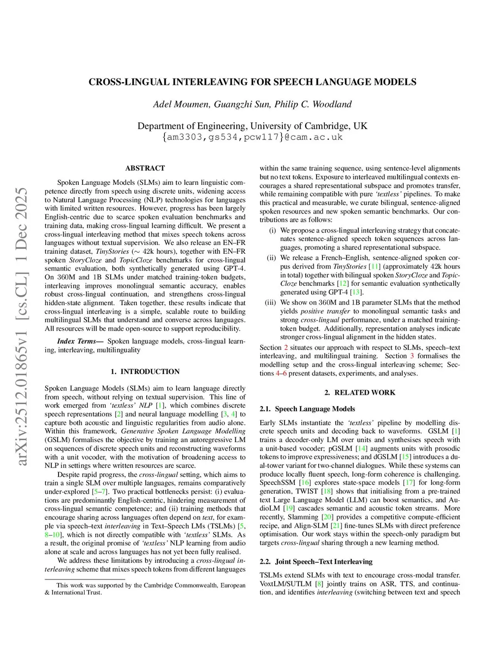 Spoken Language Models (SLMs) aim to learn linguistic competence directly from speech using discrete units, widening access to Natural Language Processing (NLP) technologies for languages with limited written resources. However, progress has been largely English-centric due to scarce spoken evaluation benchmarks and training data, making cross-lingual learning difficult. We present a cross-lingual interleaving method that mixes speech tokens across languages without textual supervision. We also release an EN-FR training dataset, TinyStories (~42k hours), together with EN-FR spoken StoryCloze and TopicCloze benchmarks for cross-lingual semantic evaluation, both synthetically generated using GPT-4. On 360M and 1B SLMs under matched training-token budgets, interleaving improves monolingual semantic accuracy, enables robust cross-lingual continuation, and strengthens cross-lingual hidden-state alignment. Taken together, these results indicate that cross-lingual interleaving is a simple, scalable route to building multilingual SLMs that understand and converse across languages. All resources will be made open-source to support reproducibility.