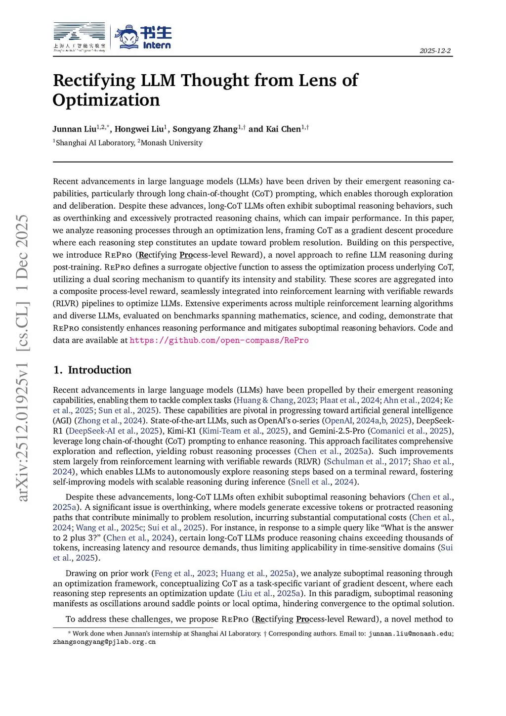 Recent advancements in large language models (LLMs) have been driven by their emergent reasoning capabilities, particularly through long chain-of-thought (CoT) prompting, which enables thorough exploration and deliberation. Despite these advances, long-CoT LLMs often exhibit suboptimal reasoning behaviors, such as overthinking and excessively protracted reasoning chains, which can impair performance. In this paper, we analyze reasoning processes through an optimization lens, framing CoT as a gradient descent procedure where each reasoning step constitutes an update toward problem resolution. Building on this perspective, we introduce RePro (Rectifying Process-level Reward), a novel approach to refine LLM reasoning during post-training. RePro defines a surrogate objective function to assess the optimization process underlying CoT, utilizing a dual scoring mechanism to quantify its intensity and stability. These scores are aggregated into a composite process-level reward, seamlessly integrated into reinforcement learning with verifiable rewards (RLVR) pipelines to optimize LLMs. Extensive experiments across multiple reinforcement learning algorithms and diverse LLMs, evaluated on benchmarks spanning mathematics, science, and coding, demonstrate that RePro consistently enhances reasoning performance and mitigates suboptimal reasoning behaviors.