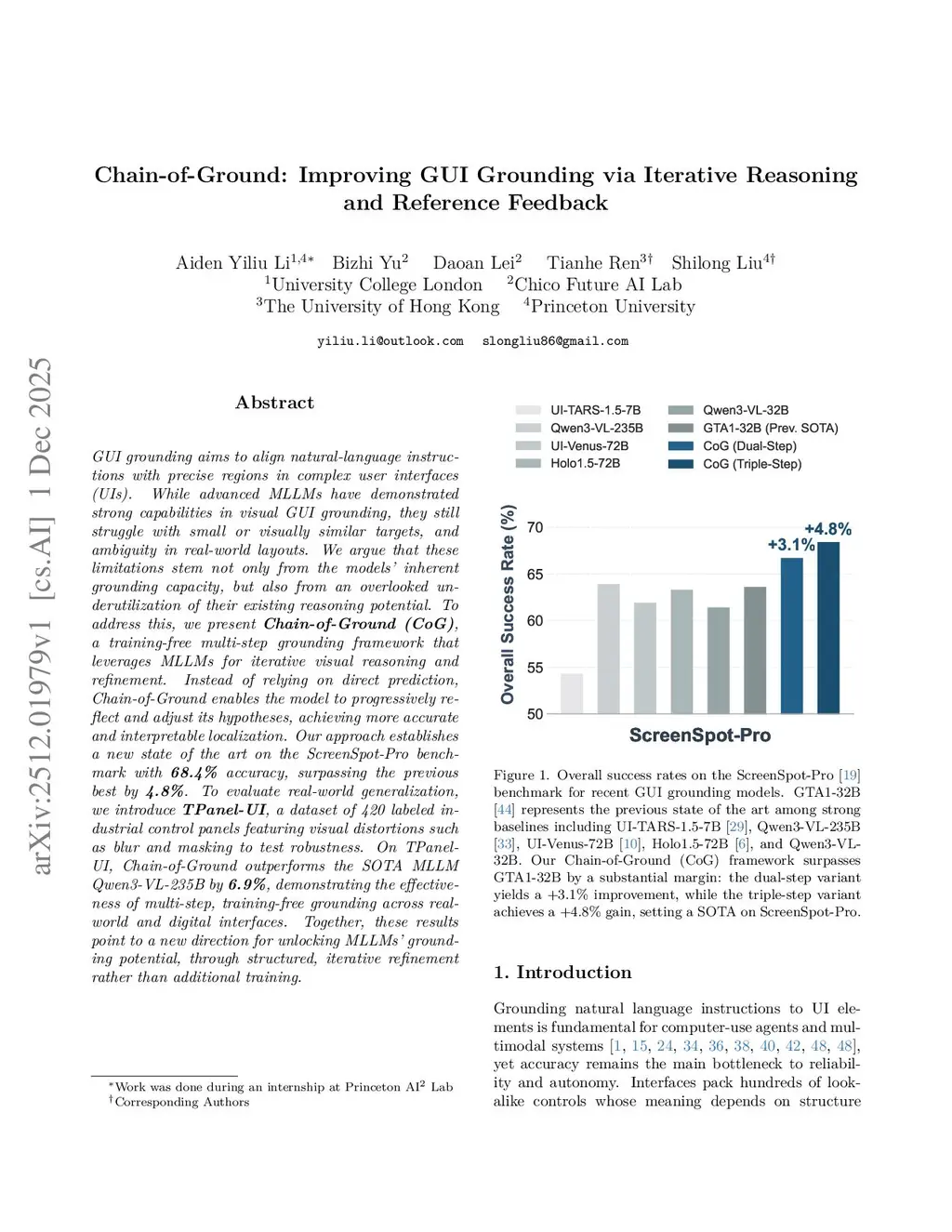 GUI grounding aims to align natural language instructions with precise regions in complex user interfaces. Advanced multimodal large language models show strong ability in visual GUI grounding but still struggle with small or visually similar targets and ambiguity in real world layouts. These limitations arise from limited grounding capacity and from underuse of existing reasoning potential. We present Chain of Ground CoG a training free multi step grounding framework that uses multimodal large language models for iterative visual reasoning and refinement. Instead of direct prediction the model progressively reflects and adjusts its hypotheses leading to more accurate and interpretable localization. Our approach achieves 68.4 accuracy on the ScreenSpot Pro benchmark an improvement of 4.8 points. To measure real world generalization we introduce TPanel UI a dataset of 420 labeled industrial control panels with visual distortions such as blur and masking. On TPanel UI Chain of Ground improves over the strong baseline Qwen3 VL 235B by 6.9 points showing the effectiveness of multi step training free grounding across real world and digital interfaces. These results highlight a direction for unlocking grounding potential through structured iterative refinement instead of additional training.