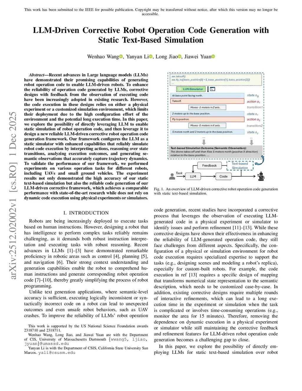 LLM-Driven Corrective Robot Operation Code Generation with Static Text-Based Simulation