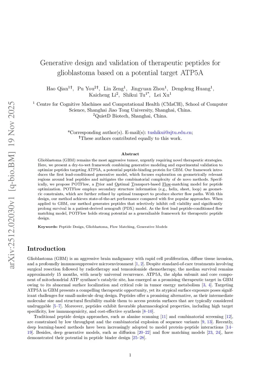 Glioblastoma (GBM) remains the most aggressive tumor, urgently requiring novel therapeutic strategies. Here, we present a dry-to-wet framework combining generative modeling and experimental validation to optimize peptides targeting ATP5A, a potential peptide-binding protein for GBM. Our framework introduces the first lead-conditioned generative model, which focuses exploration on geometrically relevant regions around lead peptides and mitigates the combinatorial complexity of de novo methods. Specifically, we propose POTFlow, a \underline{P}rior and \underline{O}ptimal \underline{T}ransport-based \underline{Flow}-matching model for peptide optimization. POTFlow employs secondary structure information (e.g., helix, sheet, loop) as geometric constraints, which are further refined by optimal transport to produce shorter flow paths. With this design, our method achieves state-of-the-art performance compared with five popular approaches. When applied to GBM, our method generates peptides that selectively inhibit cell viability and significantly prolong survival in a patient-derived xenograft (PDX) model. As the first lead peptide-conditioned flow matching model, POTFlow holds strong potential as a generalizable framework for therapeutic peptide design.
