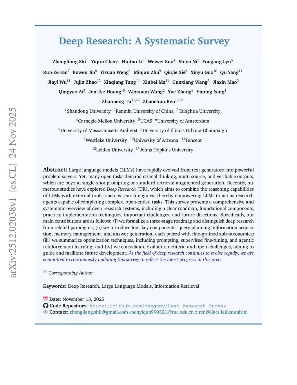 Large language models (LLMs) have rapidly evolved from text generators into powerful problem solvers. Yet, many open tasks demand critical thinking, multi-source, and verifiable outputs, which are beyond single-shot prompting or standard retrieval-augmented generation. Recently, numerous studies have explored Deep Research (DR), which aims to combine the reasoning capabilities of LLMs with external tools, such as search engines, thereby empowering LLMs to act as research agents capable of completing complex, open-ended tasks. This survey presents a comprehensive and systematic overview of deep research systems, including a clear roadmap, foundational components, practical implementation techniques, important challenges, and future directions. Specifically, our main contributions are as follows: (i) we formalize a three-stage roadmap and distinguish deep research from related paradigms; (ii) we introduce four key components: query planning, information acquisition, memory management, and answer generation, each paired with fine-grained sub-taxonomies; (iii) we summarize optimization techniques, including prompting, supervised fine-tuning, and agentic reinforcement learning; and (iv) we consolidate evaluation criteria and open challenges, aiming to guide and facilitate future development. As the field of deep research continues to evolve rapidly, we are committed to continuously updating this survey to reflect the latest progress in this area.