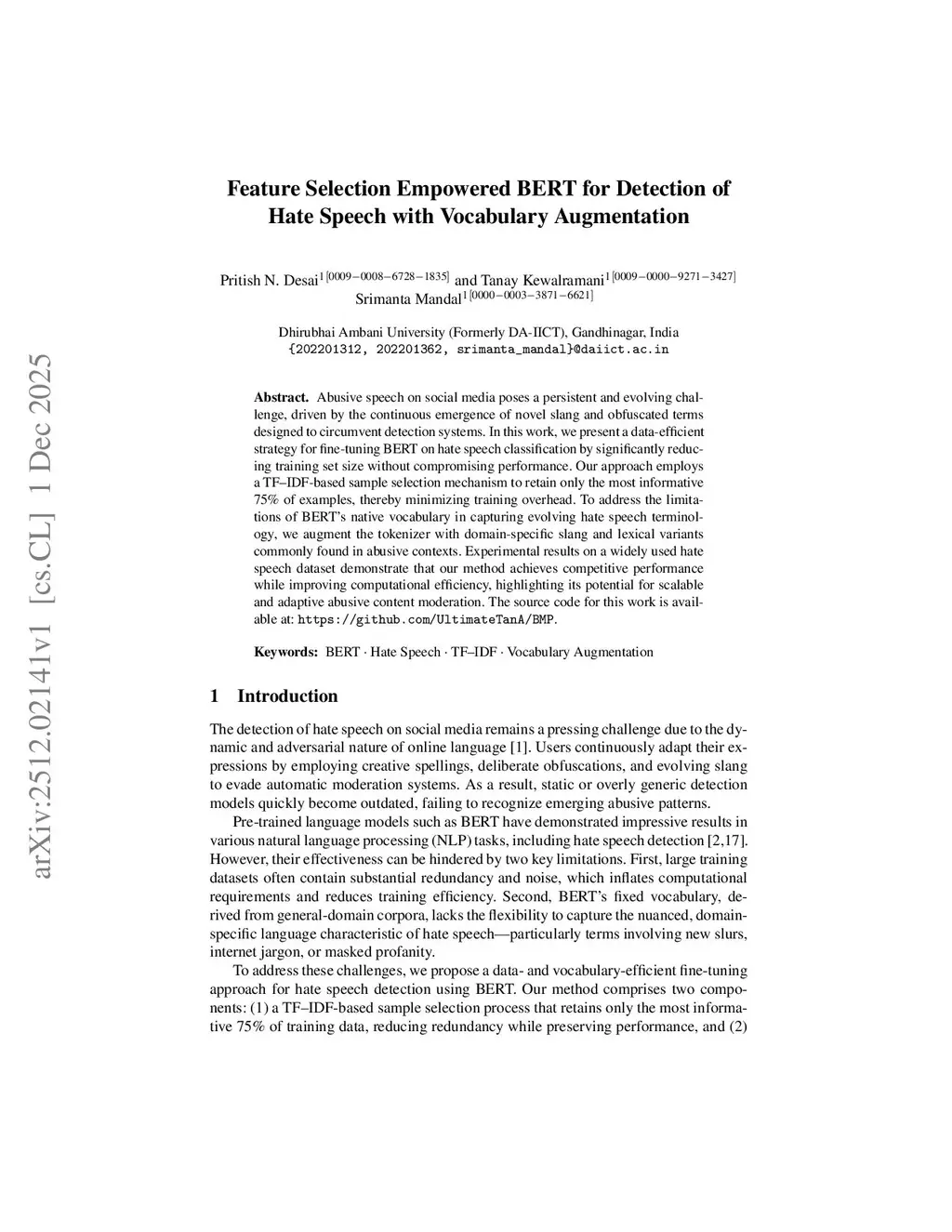 Feature Selection Empowered BERT for Detection of Hate Speech with Vocabulary Augmentation