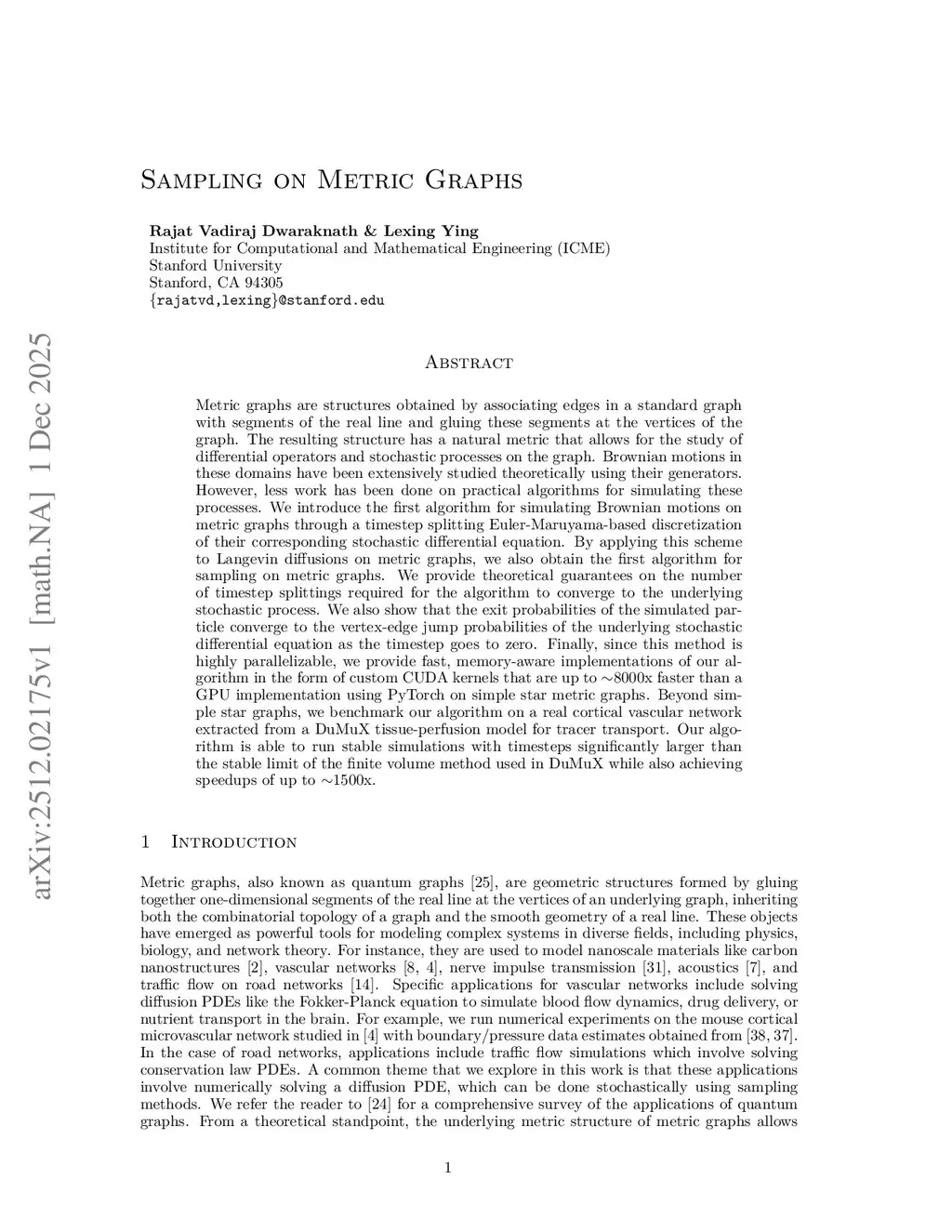 Metric graphs are structures obtained by associating edges in a standard graph with segments of the real line and gluing these segments at the vertices of the graph. The resulting structure has a natural metric that allows for the study of differential operators and stochastic processes on the graph. Brownian motions in these domains have been extensively studied theoretically using their generators. However, less work has been done on practical algorithms for simulating these processes. We introduce the first algorithm for simulating Brownian motions on metric graphs through a timestep splitting Euler-Maruyama-based discretization of their corresponding stochastic differential equation. By applying this scheme to Langevin diffusions on metric graphs, we also obtain the first algorithm for sampling on metric graphs. We provide theoretical guarantees on the number of timestep splittings required for the algorithm to converge to the underlying stochastic process. We also show that the exit probabilities of the simulated particle converge to the vertex-edge jump probabilities of the underlying stochastic differential equation as the timestep goes to zero. Finally, since this method is highly parallelizable, we provide fast, memory-aware implementations of our algorithm in the form of custom CUDA kernels that are up to ~8000x faster than a GPU implementation using PyTorch on simple star metric graphs. Beyond simple star graphs, we benchmark our algorithm on a real cortical vascular network extracted from a DuMuX tissue-perfusion model for tracer transport. Our algorithm is able to run stable simulations with timesteps significantly larger than the stable limit of the finite volume method used in DuMuX while also achieving speedups of up to ~1500x.
