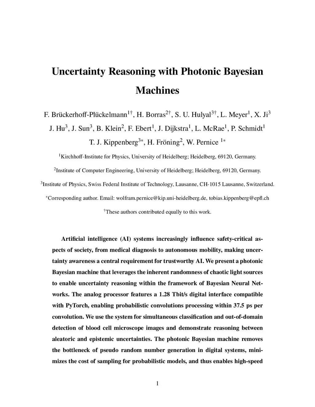 Artificial intelligence (AI) systems increasingly influence safety-critical aspects of society, from medical diagnosis to autonomous mobility, making uncertainty awareness a central requirement for trustworthy AI. We present a photonic Bayesian machine that leverages the inherent randomness of chaotic light sources to enable uncertainty reasoning within the framework of Bayesian Neural Networks. The analog processor features a 1.28 Tbit/s digital interface compatible with PyTorch, enabling probabilistic convolutions processing within 37.5 ps per convolution. We use the system for simultaneous classification and out-of-domain detection of blood cell microscope images and demonstrate reasoning between aleatoric and epistemic uncertainties. The photonic Bayesian machine removes the bottleneck of pseudo random number generation in digital systems, minimizes the cost of sampling for probabilistic models, and thus enables high-speed trustworthy AI systems.