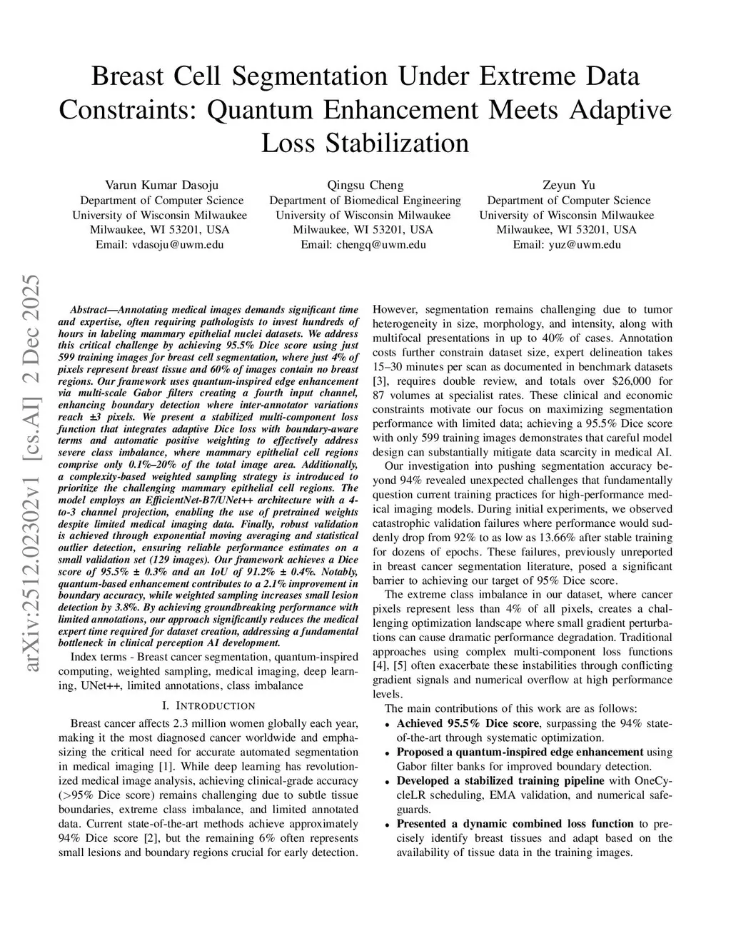 Annotating medical images demands significant time and expertise, often requiring pathologists to invest hundreds of hours in labeling mammary epithelial nuclei datasets. We address this critical challenge by achieving 95.5% Dice score using just 599 training images for breast cell segmentation, where just 4% of pixels represent breast tissue and 60% of images contain no breast regions. Our framework uses quantum-inspired edge enhancement via multi-scale Gabor filters creating a fourth input channel, enhancing boundary detection where inter-annotator variations reach +/- 3 pixels. We present a stabilized multi-component loss function that integrates adaptive Dice loss with boundary-aware terms and automatic positive weighting to effectively address severe class imbalance, where mammary epithelial cell regions comprise only 0.1%-20% of the total image area. Additionally, a complexity-based weighted sampling strategy is introduced to prioritize the challenging mammary epithelial cell regions. The model employs an EfficientNet-B7/UNet++ architecture with a 4-to-3 channel projection, enabling the use of pretrained weights despite limited medical imaging data. Finally, robust validation is achieved through exponential moving averaging and statistical outlier detection, ensuring reliable performance estimates on a small validation set (129 images). Our framework achieves a Dice score of 95.5% +/- 0.3% and an IoU of 91.2% +/- 0.4%. Notably, quantum-based enhancement contributes to a 2.1% improvement in boundary accuracy, while weighted sampling increases small lesion detection by 3.8%. By achieving groundbreaking performance with limited annotations, our approach significantly reduces the medical expert time required for dataset creation, addressing a fundamental bottleneck in clinical perception AI development.