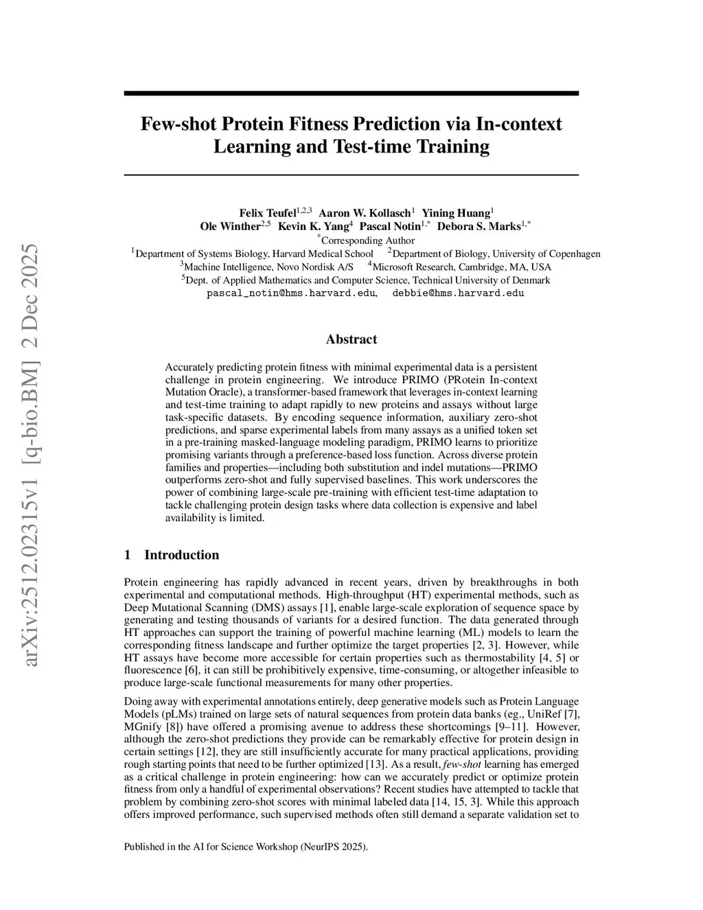 Accurately predicting protein fitness with minimal experimental data is a persistent challenge in protein engineering. We introduce PRIMO (PRotein In-context Mutation Oracle), a transformer-based framework that leverages in-context learning and test-time training to adapt rapidly to new proteins and assays without large task-specific datasets. By encoding sequence information, auxiliary zero-shot predictions, and sparse experimental labels from many assays as a unified token set in a pre-training masked-language modeling paradigm, PRIMO learns to prioritize promising variants through a preference-based loss function. Across diverse protein families and properties-including both substitution and indel mutations-PRIMO outperforms zero-shot and fully supervised baselines. This work underscores the power of combining large-scale pre-training with efficient test-time adaptation to tackle challenging protein design tasks where data collection is expensive and label availability is limited.