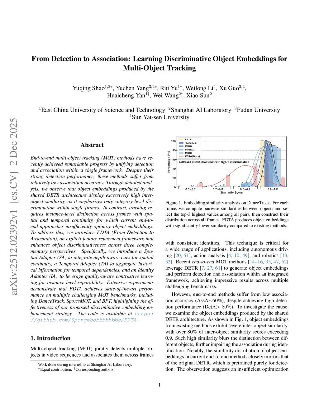 End-to-end multi-object tracking (MOT) methods have recently achieved remarkable progress by unifying detection and association within a single framework. Despite their strong detection performance, these methods suffer from relatively low association accuracy. Through detailed analysis, we observe that object embeddings produced by the shared DETR architecture display excessively high inter-object similarity, as it emphasizes only category-level discrimination within single frames. In contrast, tracking requires instance-level distinction across frames with spatial and temporal continuity, for which current end-to-end approaches insufficiently optimize object embeddings. To address this, we introduce FDTA (From Detection to Association), an explicit feature refinement framework that enhances object discriminativeness across three complementary perspectives. Specifically, we introduce a Spatial Adapter (SA) to integrate depth-aware cues for spatial continuity, a Temporal Adapter (TA) to aggregate historical information for temporal dependencies, and an Identity Adapter (IA) to leverage quality-aware contrastive learning for instance-level separability. Extensive experiments demonstrate that FDTA achieves state-of-the-art performance on multiple challenging MOT benchmarks, including DanceTrack, SportsMOT, and BFT, highlighting the effectiveness of our proposed discriminative embedding enhancement strategy. The code is available atthis https URL.