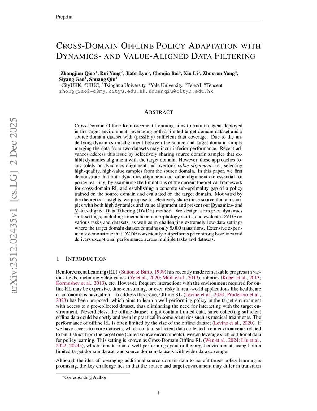 Cross-Domain Offline Reinforcement Learning aims to train an agent deployed in the target environment, leveraging both a limited target domain dataset and a source domain dataset with (possibly) sufficient data coverage. Due to the underlying dynamics misalignment between the source and target domain, simply merging the data from two datasets may incur inferior performance. Recent advances address this issue by selectively sharing source domain samples that exhibit dynamics alignment with the target domain. However, these approaches focus solely on dynamics alignment and overlook \textit{value alignment}, i.e., selecting high-quality, high-value samples from the source domain. In this paper, we first demonstrate that both dynamics alignment and value alignment are essential for policy learning, by examining the limitations of the current theoretical framework for cross-domain RL and establishing a concrete sub-optimality gap of a policy trained on the source domain and evaluated on the target domain. Motivated by the theoretical insights, we propose to selectively share those source domain samples with both high dynamics and value alignment and present our \textbf{\underline{D}}ynamics- and \textbf{\underline{V}}alue-aligned \textbf{\underline{D}}ata \textbf{\underline{F}}iltering (DVDF) method. We design a range of dynamics shift settings, including kinematic and morphology shifts, and evaluate DVDF on various tasks and datasets, as well as in challenging extremely low-data settings where the target domain dataset contains only 5,000 transitions. Extensive experiments demonstrate that DVDF consistently outperforms prior strong baselines and delivers exceptional performance across multiple tasks and datasets.