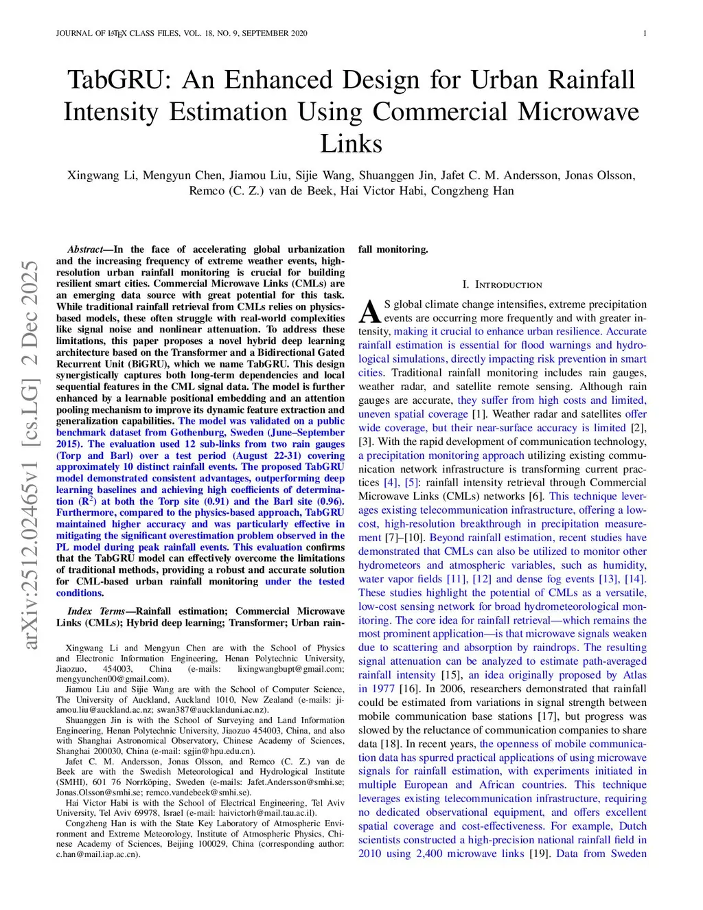 In the face of accelerating global urbanization and the increasing frequency of extreme weather events, highresolution urban rainfall monitoring is crucial for building resilient smart cities. Commercial Microwave Links (CMLs) are an emerging data source with great potential for thisthis http URLtraditional rainfall retrieval from CMLs relies on physicsbased models, these often struggle with real-world complexities like signal noise and nonlinear attenuation. To address these limitations, this paper proposes a novel hybrid deep learning architecture based on the Transformer and a Bidirectional Gated Recurrent Unit (BiGRU), which we name TabGRU. This design synergistically captures both long-term dependencies and local sequential features in the CML signal data. The model is further enhanced by a learnable positional embedding and an attention pooling mechanism to improve its dynamic feature extraction and generalization capabilities. The model was validated on a public benchmark dataset from Gothenburg, Sweden (June-September 2015). The evaluation used 12 sub-links from two rain gauges (Torp and Barl) over a test period (August 22-31) covering approximately 10 distinct rainfall events. The proposed TabGRU model demonstrated consistent advantages, outperforming deep learning baselines and achieving high coefficients of determination (R2) at both the Torp site (0.91) and the Barl site (0.96). Furthermore, compared to the physics-based approach, TabGRU maintained higher accuracy and was particularly effective in mitigating the significant overestimation problem observed in the PL model during peak rainfall events. This evaluation confirms that the TabGRU model can effectively overcome the limitations of traditional methods, providing a robust and accurate solution for CML-based urban rainfall monitoring under the tested conditions.