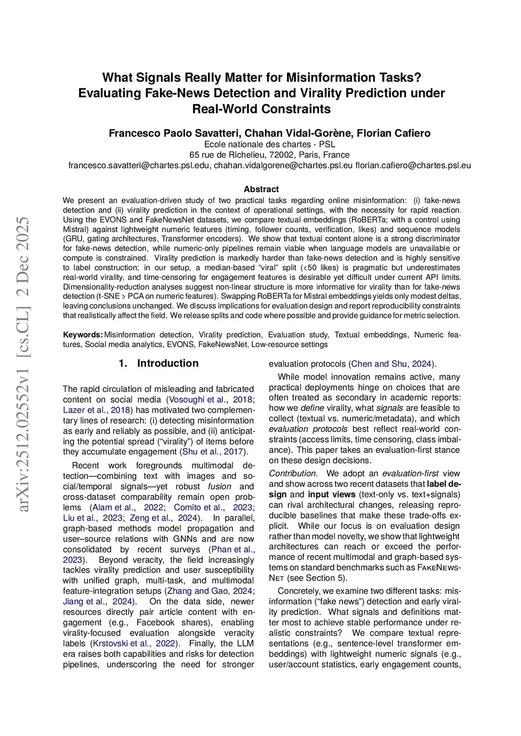 A wide part of research on misinformation has relied lies on fake-news detection, a task framed as the prediction of veracity labels attached to articles or claims. Yet social-science research has repeatedly emphasized that information manipulation goes beyond fabricated content and often relies on amplification dynamics. This theoretical turn has consequences for operationalization in applied social science research. What changes empirically when prediction targets move from veracity to diffusion? And which performance level can be attained in limited resources setups ? In this paper we compare fake-news detection and virality prediction across two datasets, EVONS and FakeNewsNet. We adopt an evaluation-first perspective and examine how benchmark behavior changes when the prediction target shifts from veracity to diffusion. Our experiments show that fake-news detection is comparatively stable once strong textual embeddings are available, whereas virality prediction is much more sensitive to operational choices such as threshold definition and early observation windows. The paper proposes practical ways to operationalize lightweight, transparent pipelines for misinformation-related prediction tasks that can rival with state-of-the-art.