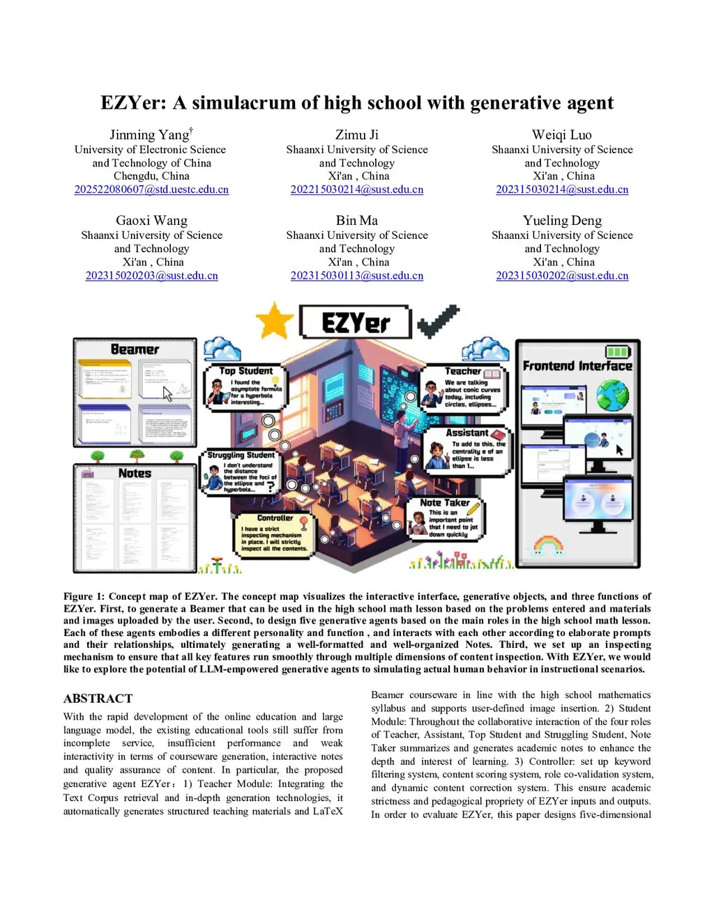 With the rapid development of the online education and large language model, the existing educational tools still suffer from incomplete service, insufficient performance and weak interactivity in terms of courseware generation, interactive notes and quality assurance of content. In particular, the proposed generative agent EZYer : 1) Teacher Module: Integrating the Text Corpus retrieval and in-depth generation technologies, it automatically generates structured teaching materials and LaTeX Beamer courseware in line with the high school mathematics syllabus and supports user-defined image insertion. 2) Student Module: Throughout the collaborative interaction of the four roles of Teacher, Assistant, Top Student and Struggling Student, Note Taker summarizes and generates academic notes to enhance the depth and interest of learning. 3) Controller: set up keyword filtering system, content scoring system, role co-validation system, and dynamic content correction system. This ensure academic strictness and pedagogical propriety of EZYer inputs and outputs. In order to evaluate EZYer, this paper designs five-dimensional evaluation indexes of content accuracy, knowledge coverage, usability, formatting correctness and visual design and appeal, and scores 100 Beamer and Notes generated by EZYer by five large language models, separately, and the results show that the quality of EZYer-generated content is excellent and has a good application prospect.